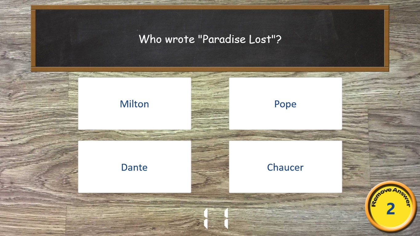 Stuck answering a question? Use your Remove Answer tokens to remove an incorrect answer and increase your chances of success. Remove Answer tokens are awarded for completing games, or can be purchased from the in-app Quiz Shop.