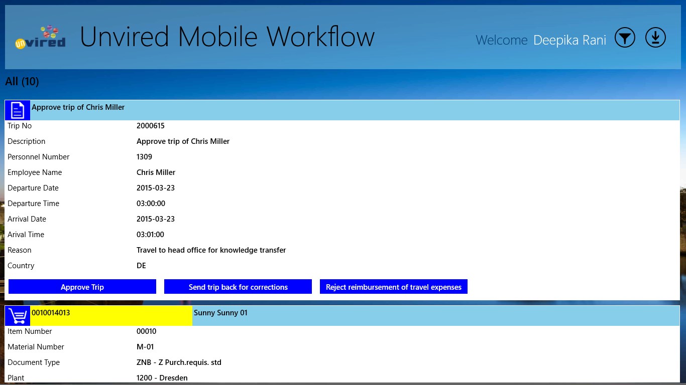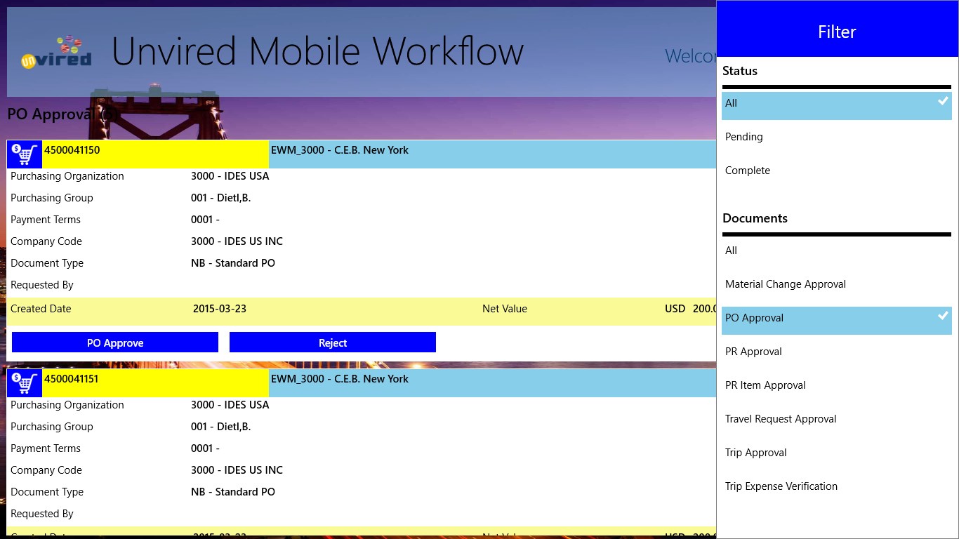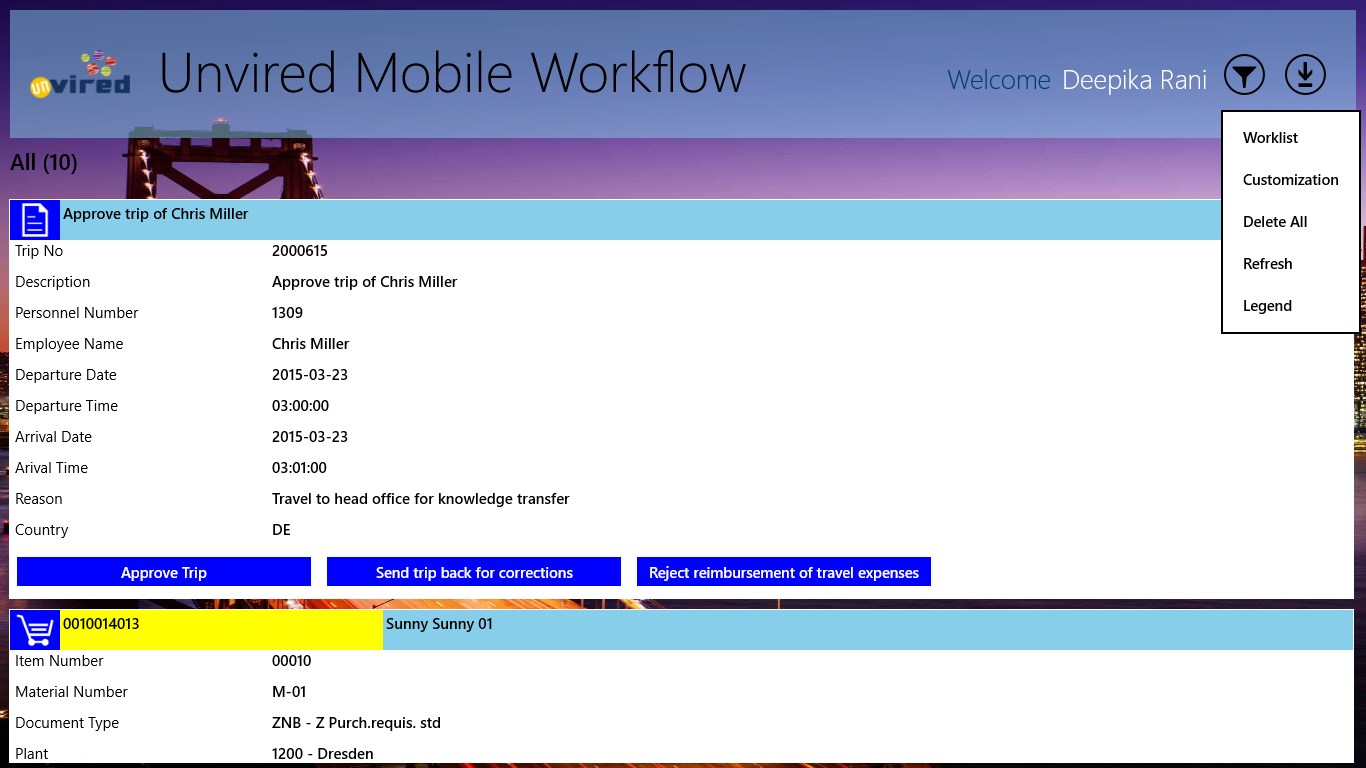 Unvired Workflow for SAP is based on SAP ERP / ECC. Unvired Workflow for SAP allows you to receive workflow documents like Purchase Orders, Purchase Requisitions, Leave Requests, Travel Requests, Travel Expenses, Claims, etc. on the mobile device for user action. Users can take action on these documents from their mobile devices.