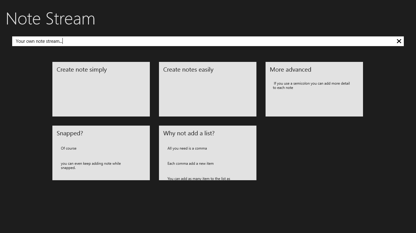 Note Stream has a simple syntax to make adding detailed notes simple. Add a body to a note with a semicolon. Need a list? Then just add a comma for each item.