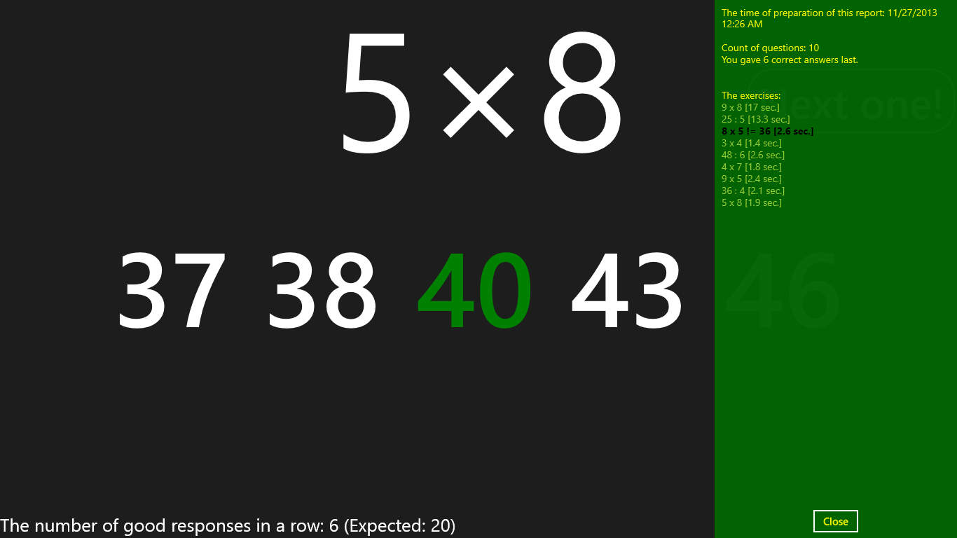 The application remembers the questions, the actual answers and the pupil's thinking time. In the report function you can see those data.