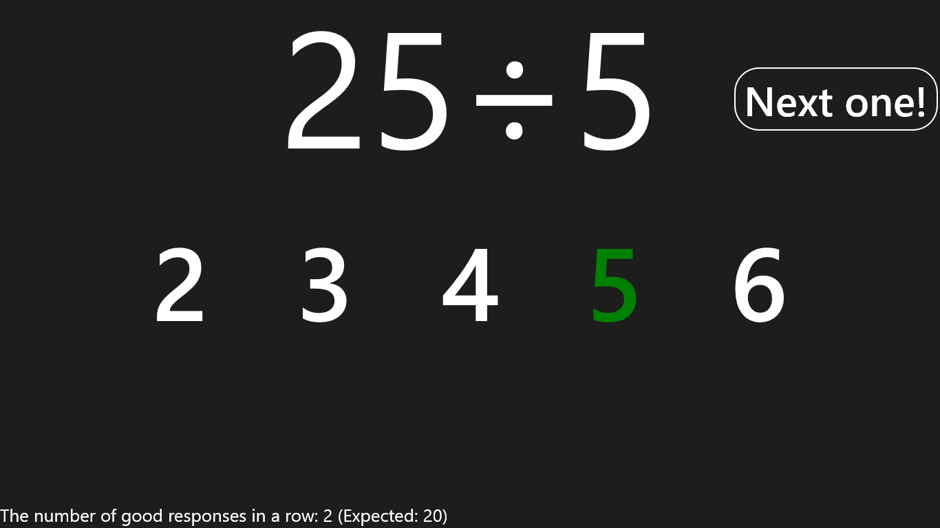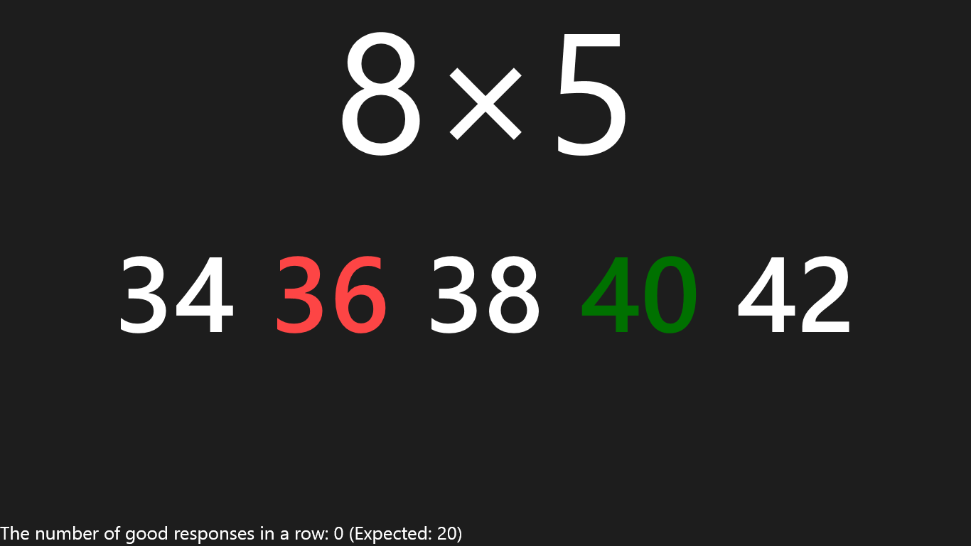 Case B: the answer is incorrect. In this case the wrong answer will be red (and fade out), and the correct (but not choosed) number will be blinking green for few seconds. The pupil can't step to the next exercise meanwhile. Therefore he/she can't choose but memorise the correct answer.