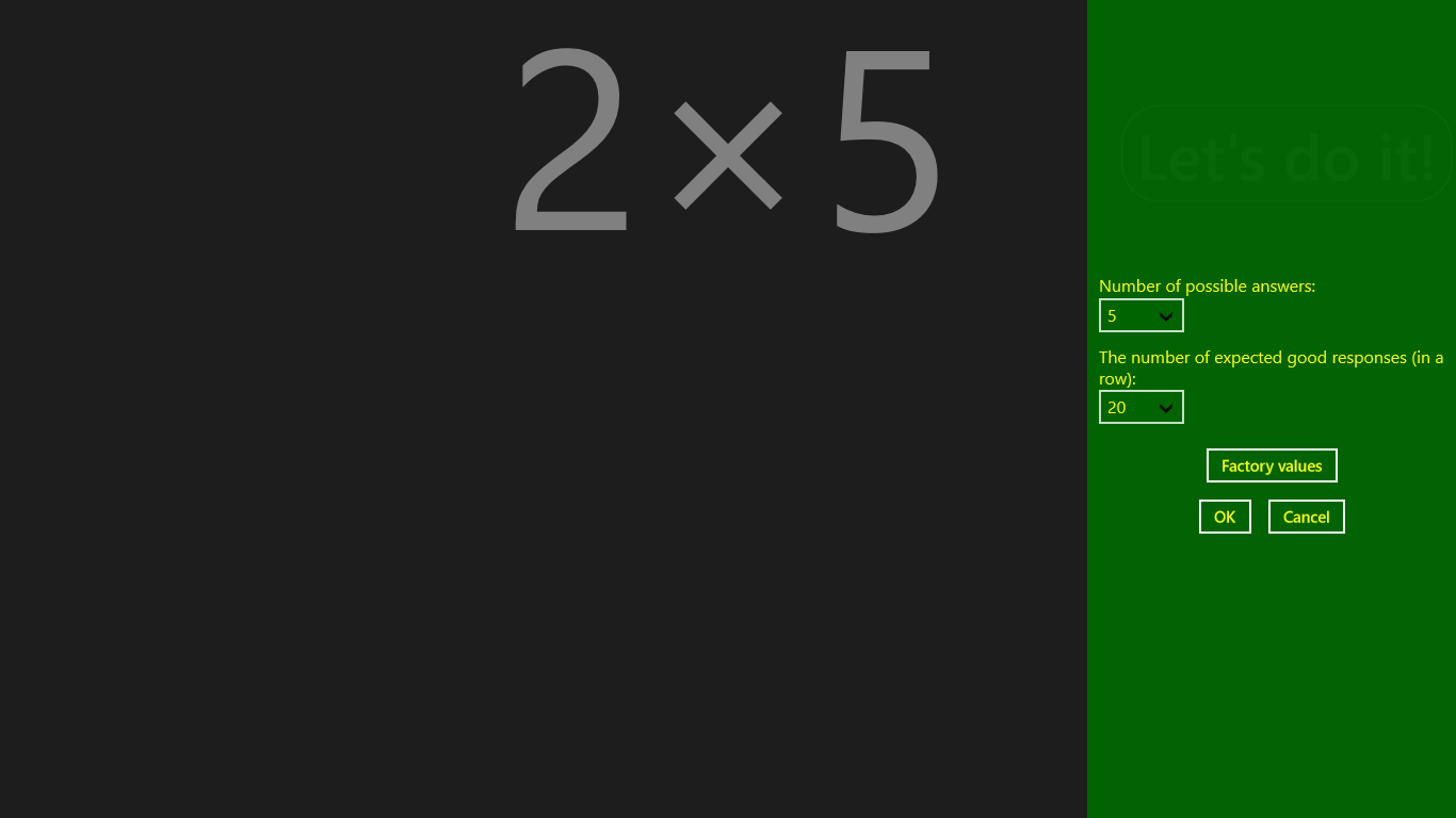 The application deals out multiplication or dividing exercises randomly. One task consists of a question and some (default: 5) possible answers, and the pupil have to choose the correct one.