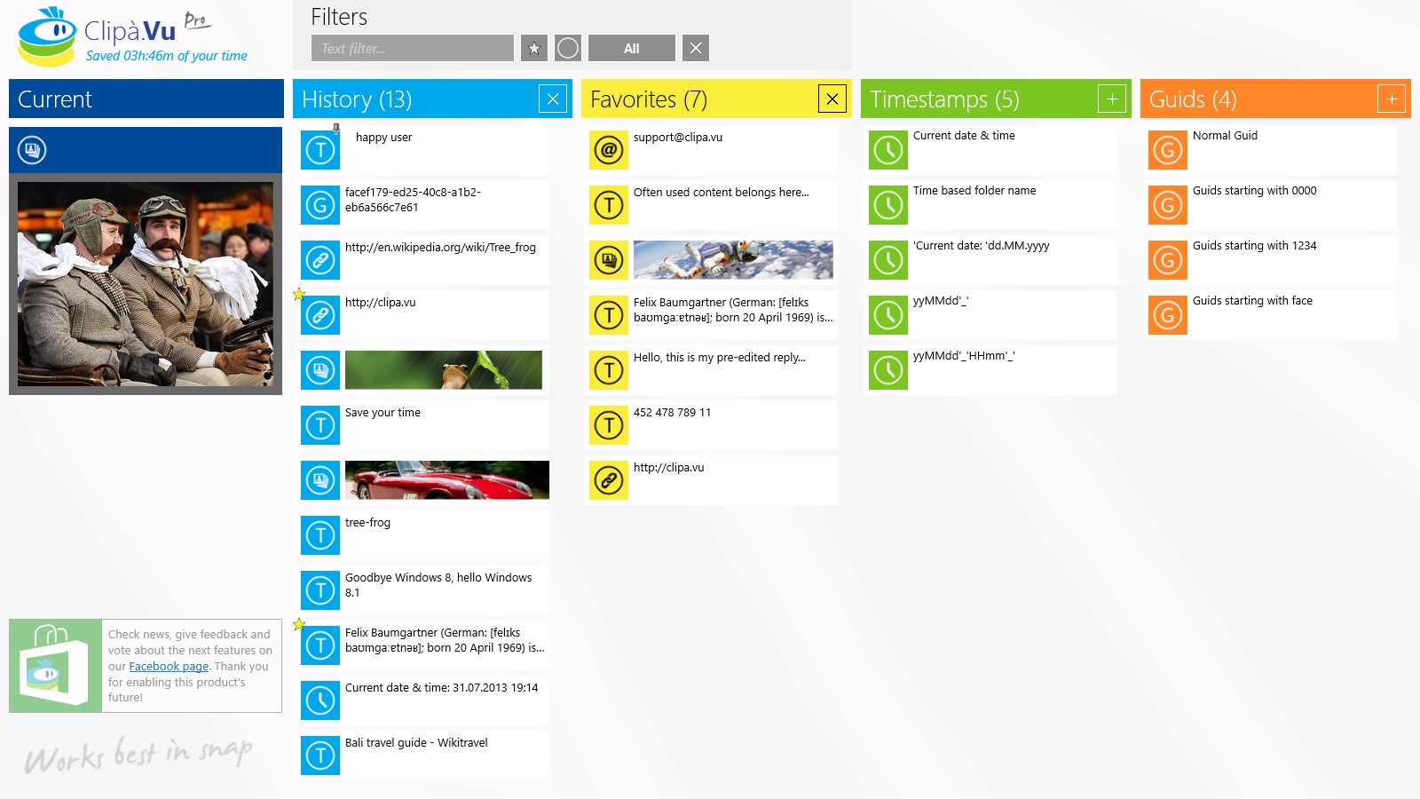 History of 999 clipboard contentsUp to 99 favorite clipsUp to 99 images savedBlasting fast filteringSharing from/to all Windows appsTimestamps for document markingClip pinning