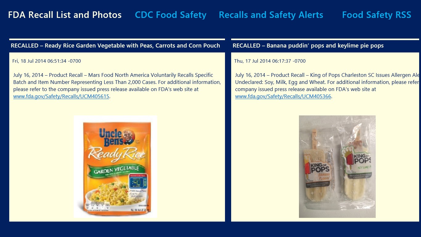Food producers recall their products from the marketplace when the products are mislabeled or when the food may present a health hazard to consumers because the food is contaminated or has caused a foodborne illness outbreak. This App aggregates info from various fda.gov, cdc.gov and foodsafety.gov RSS feeds.