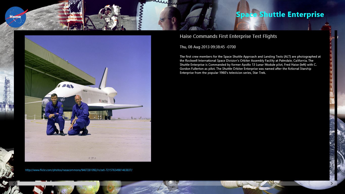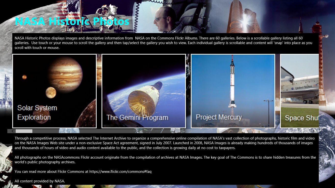 NASA Historic Photos displays images and descriptive information from NASA on the Commons Flickr Albums. There are 60 galleries. Use touch or your mouse to scroll the gallery and then tap/select the gallery you wish to view. Each individual gallery is scrollable and content will "snap" into place as you scroll with touch or mouse.