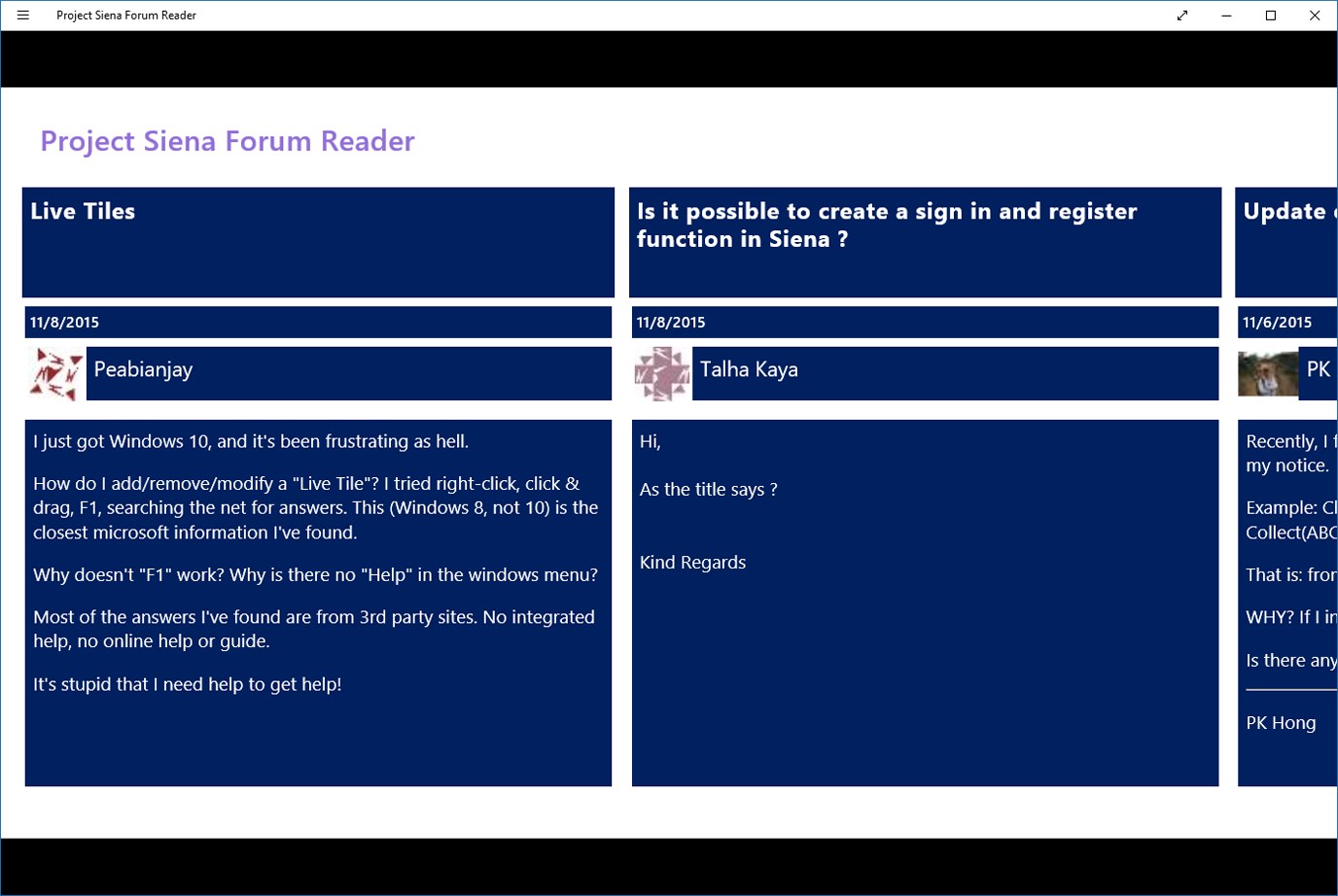 Project Siena (code name) Forum Reader is a Windows 8.1 app that enables you to build other Windows 8.1 apps! There is an active community of users posting on the TechNet Project Siena Forum. This app displays the most recent 20 topics using the RSS feed.