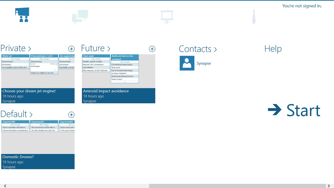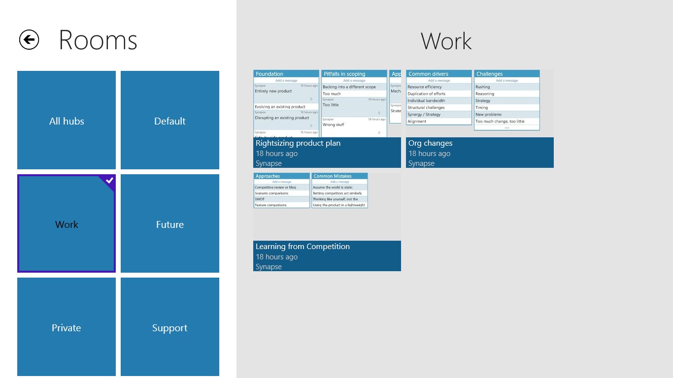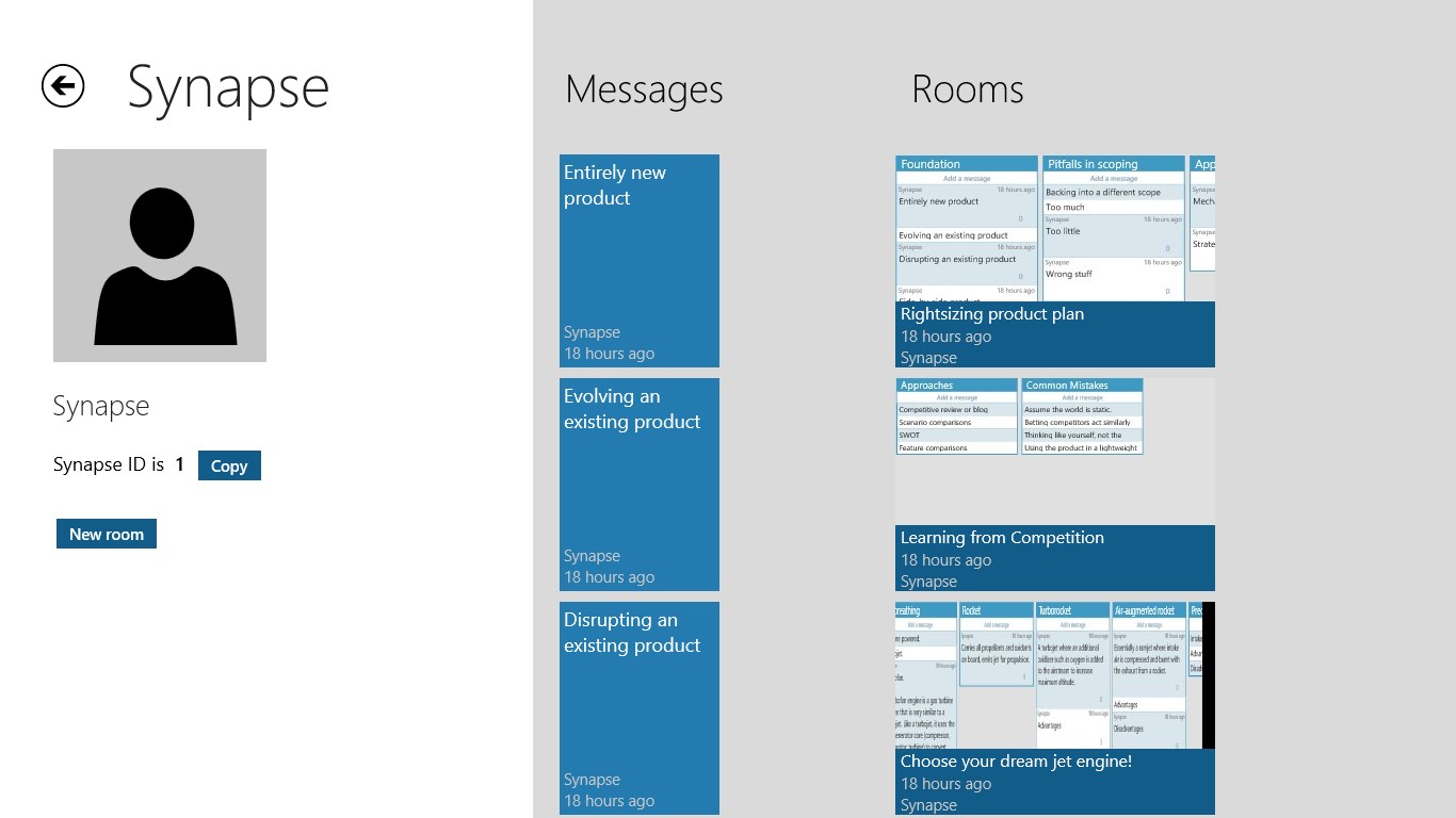 Plain text messagesSpell checking (standard Windows 8.1 one)Attachments. Any format. For image formats, there are previews. Synapse uses SkyDrive, so you will need Microsoft account.Rooms to separate different projects and manage user accessMessages can be regrouped with Drag&DropLive tile shows number of unread messages in each roomToast notification when a message arrivesStandard Search Charm - Target messages, contacts, and rooms with a single search keyword, with instant suggestions. Requires Pro subscription.Instant updates. UI instantly shows any changes/updates as you expect from a modern app. No more \“Refresh\” buttons.New messages and rooms show up at the top so that you easily notice updatesReliable time. Time of messages and rooms is correct regardless of time zones/system clock settings. It\'s synced with the server.Deep support of offline mode. Most features will work offline, seamlessly.Sync your messages across all your Windows 8.1 devices