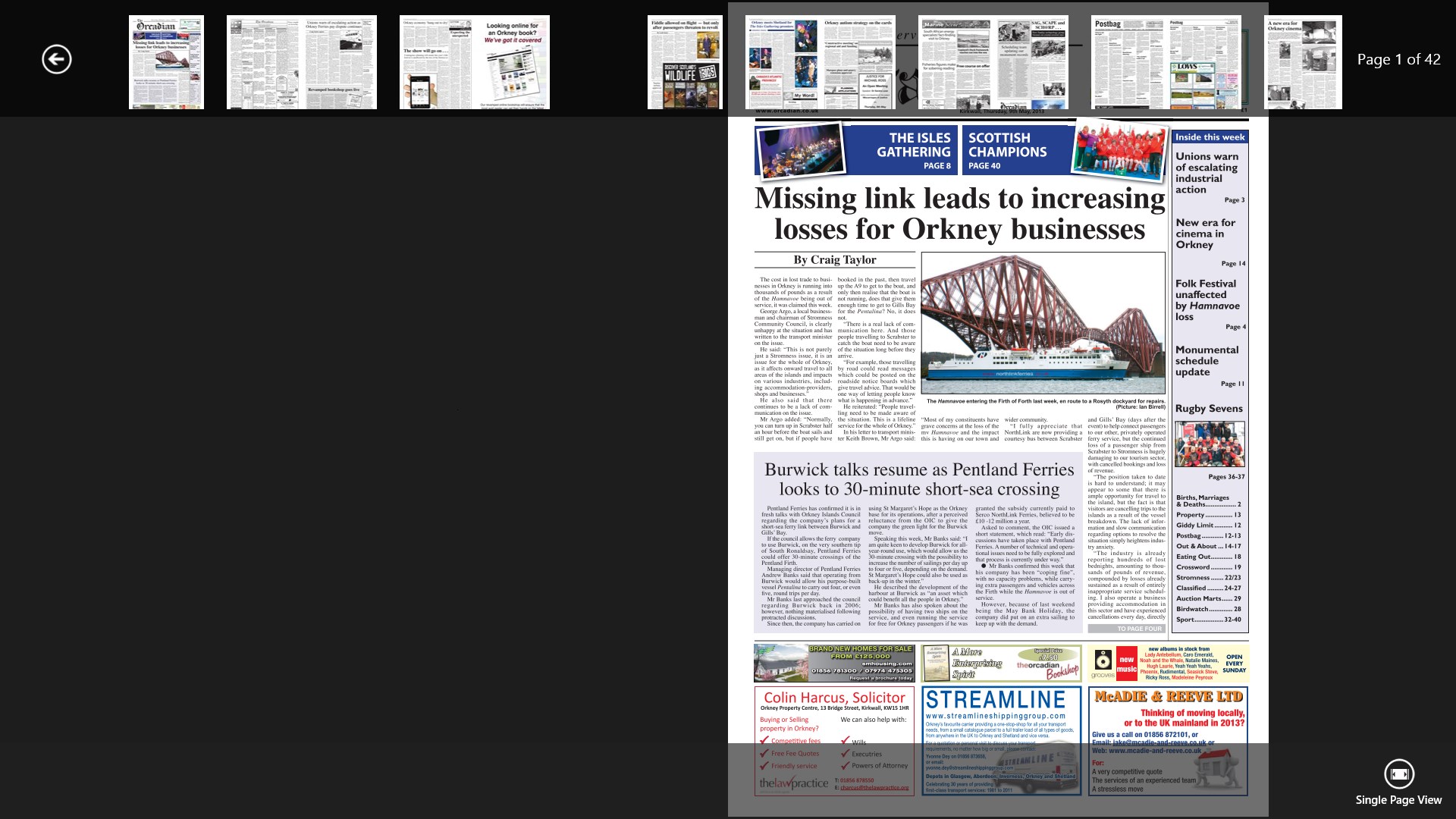 View the newspaper as a double- page spread or full screen single page, tap the page selector to choose a specific page to fast navigate to. The Orcadian App also features a zoom function to enable clearer reading of selected articles. You can also download and save individual pages to enjoy offline and when you are on the go.