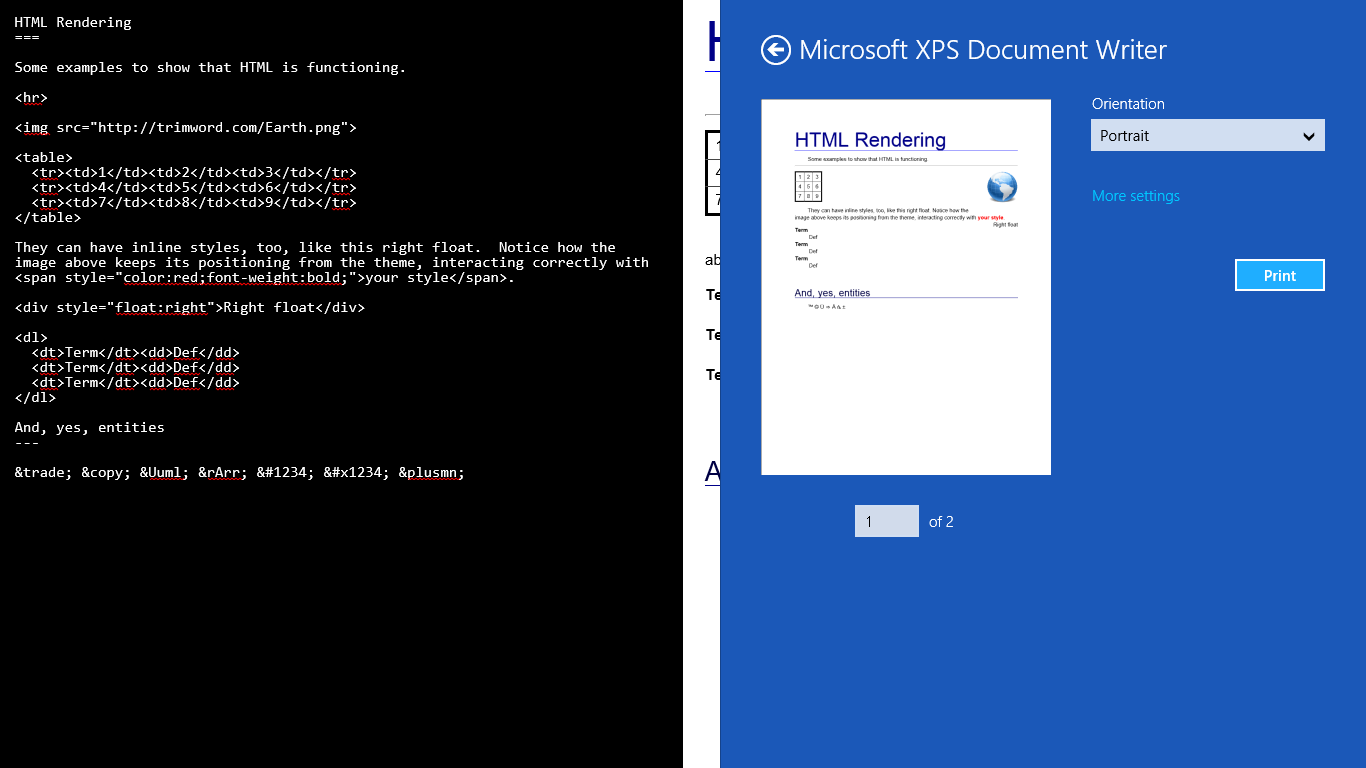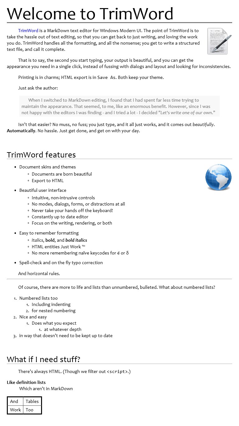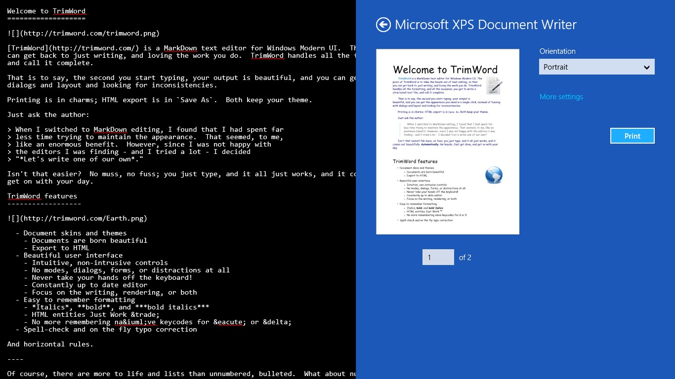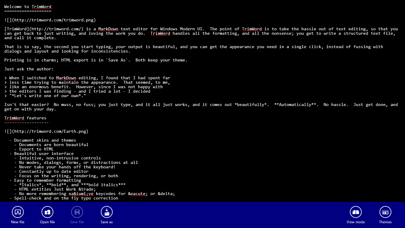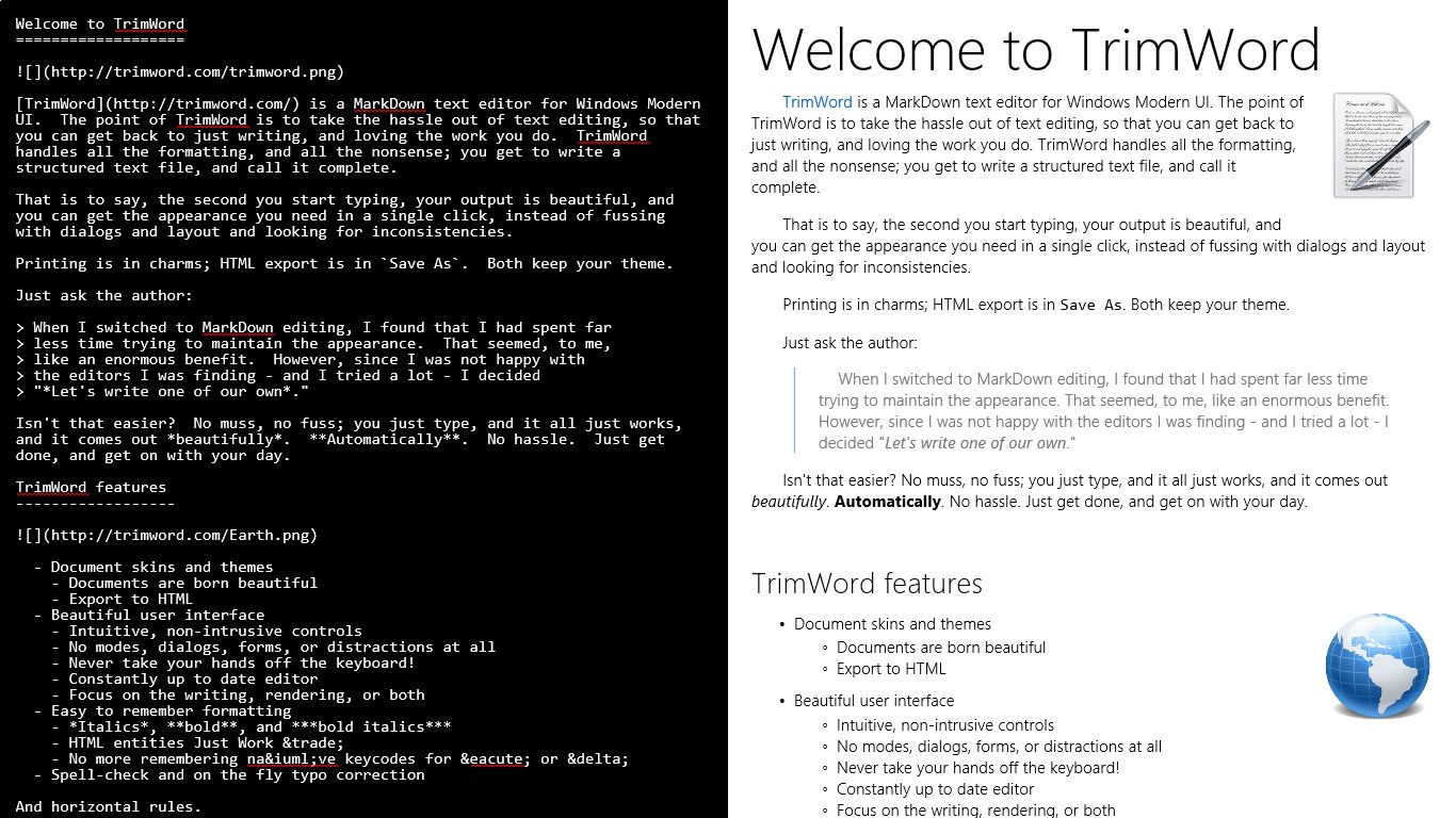 TrimWord is a MarkDown text editor for Windows Modern UI.
