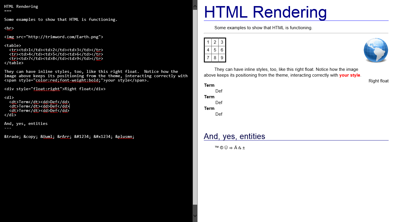 Still, when you need something more powerful, you have the option of falling back on a language you already know - HTML - without breaking the theme. Themed print, themed export to HTML, and easy inclusion of resources like images, even right from the web.