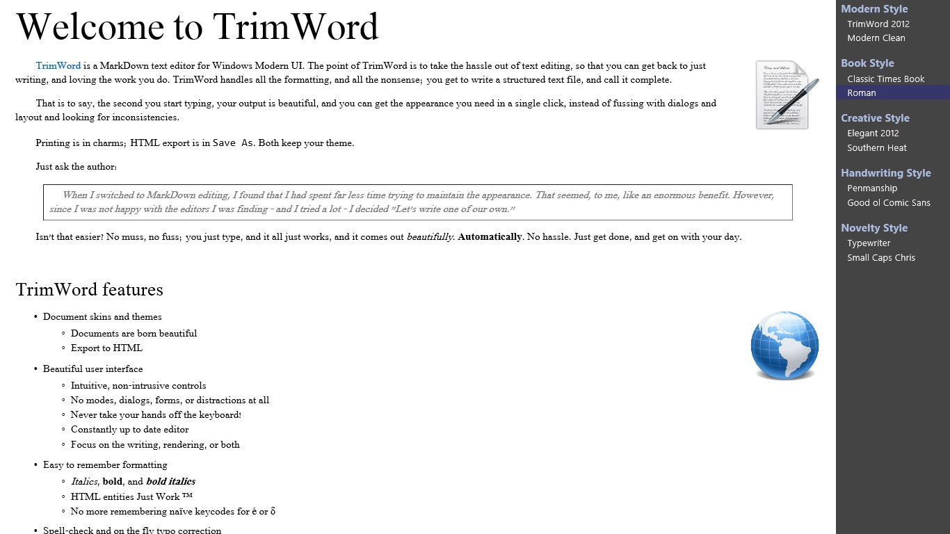 The point of TrimWord is to take the hassle out of text editing, so that you can get back to just writing, and loving the work you do. TrimWord handles all the formatting, and all the nonsense; you get to write a structured text file, and call it complete.