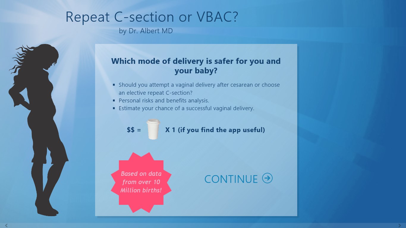Should you attempt Vaginal Delivery after Cesarean (VBAC) in your next pregnancy, or is Elective Repeat C-section a safer option for you? This unique app by Dr. Albert MD will help you choose the safest mode of delivery based on YOUR personal information. Remember, the decision regarding mode of delivery is YOURS, and no doctor can make it for you.