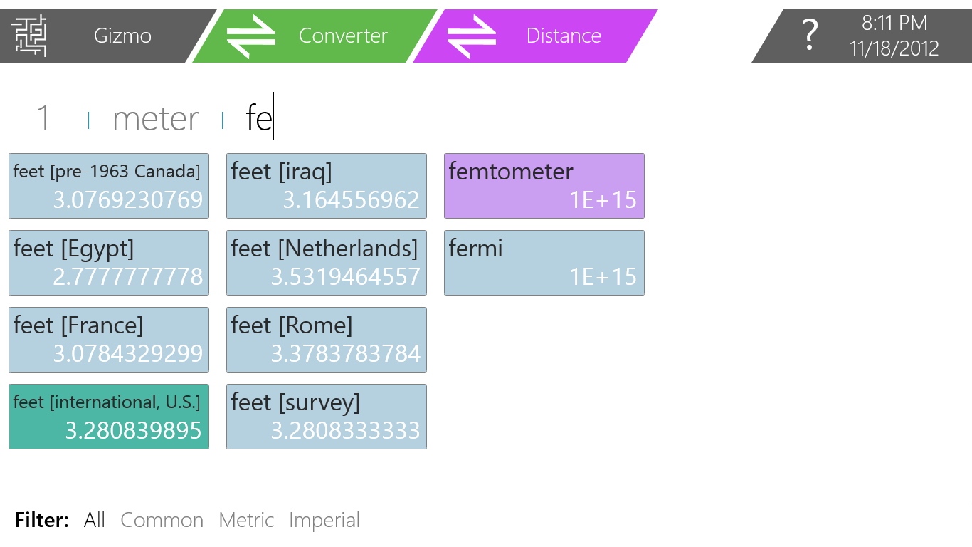 The Unit Converter Gizmo is the most powerful conversion tool available for any platform. For each of the supported conversions, you can search for and select among hundreds of units, filter the results only to specific sets (e.g. "Common" or "Metric" units) and even create your own filters! Units are color-coded by set for easy reference.