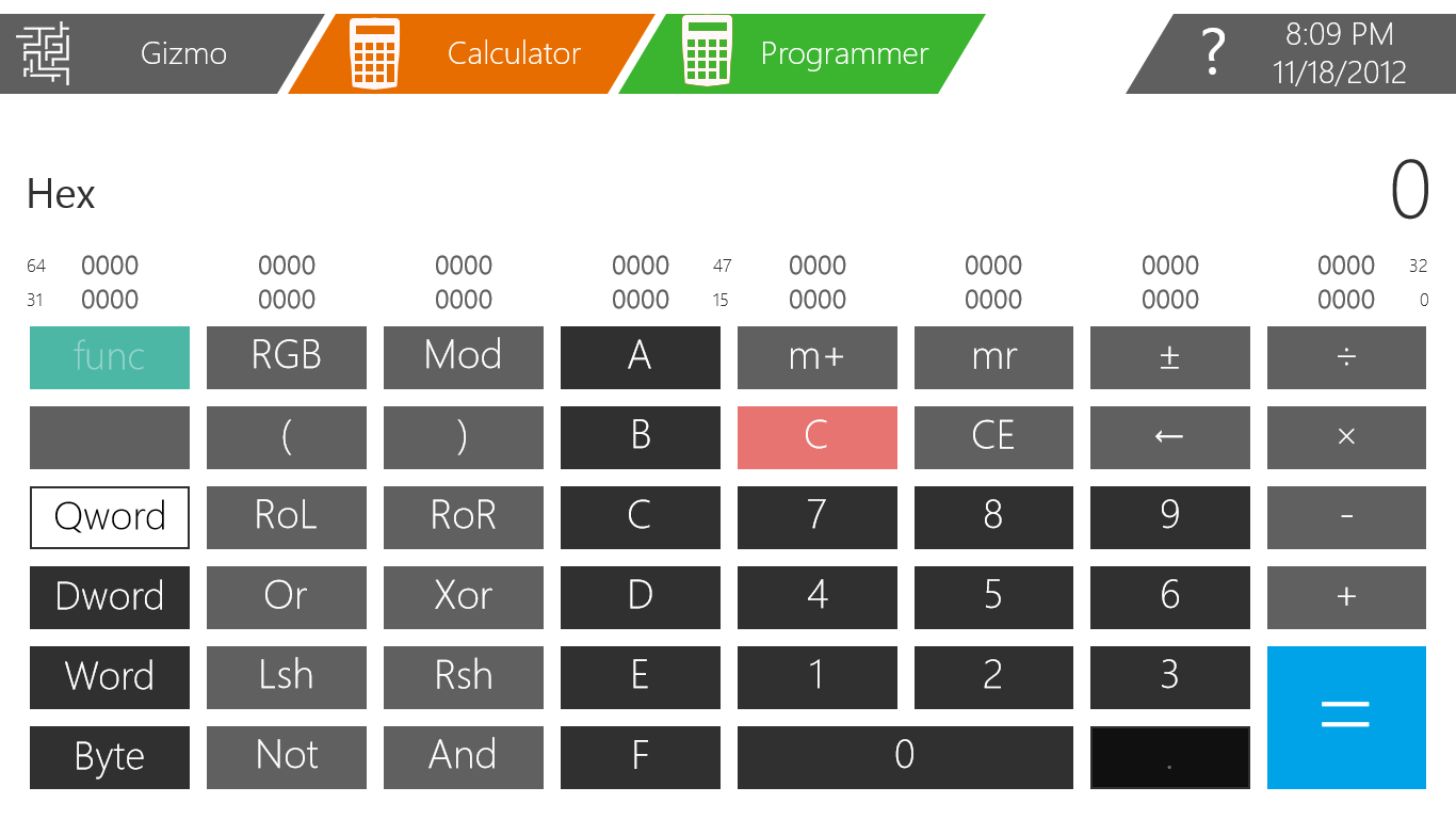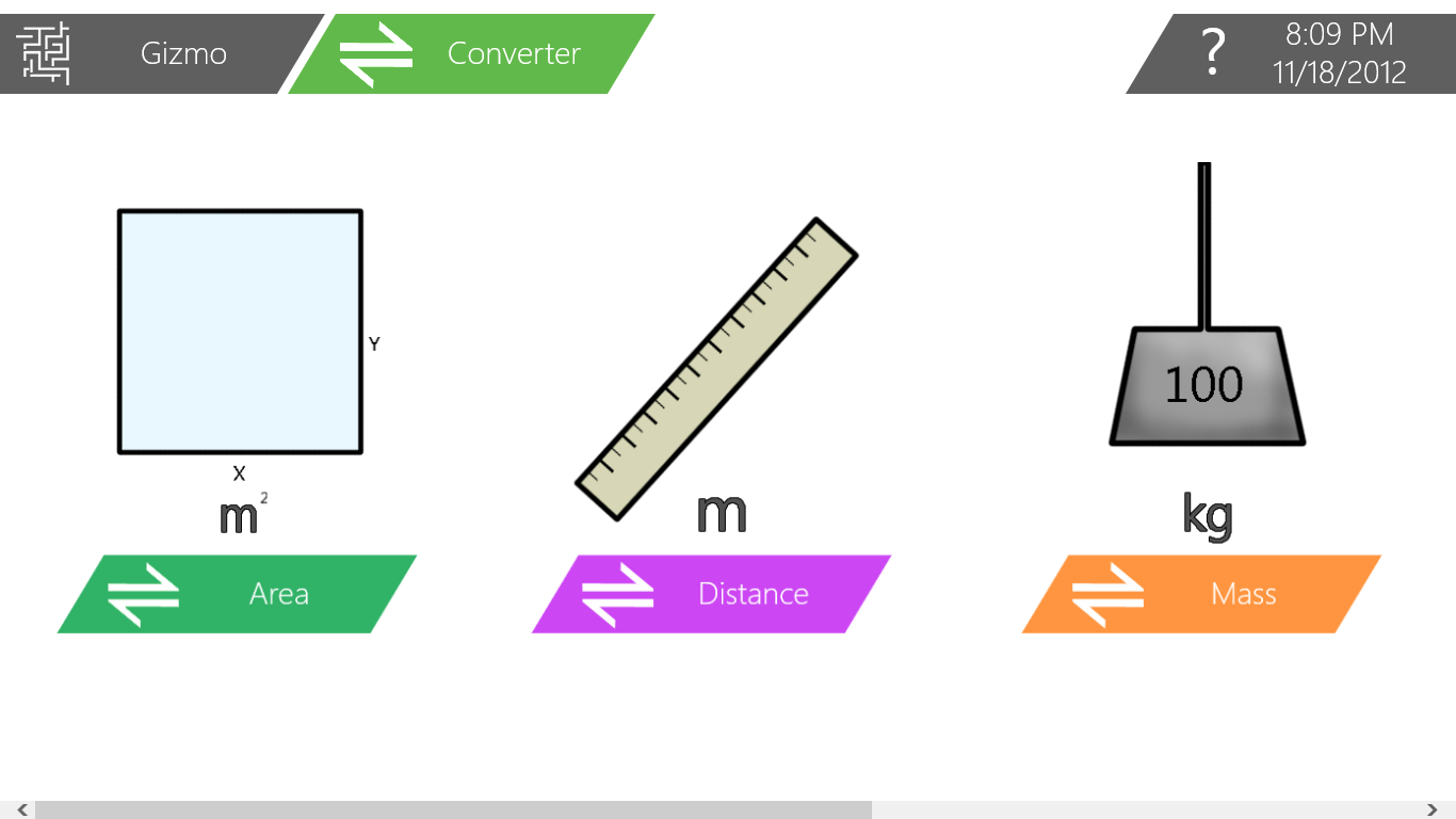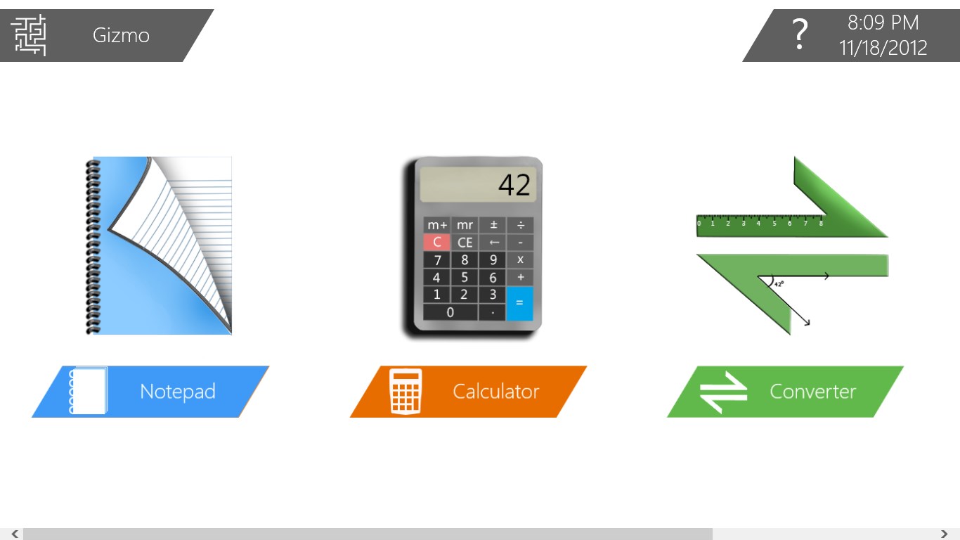 Gizmo pinning – Pin any Gizmo to your Start Screen for quick and easy access!Help dialogs – Need help? Click the question mark wherever you are!Notepad – A clean and intuitive design allows for quick loading, editing and saving of notes!Calculator – A sleek and powerful Gizmo for any calculation!Unit Converter – An elegant, yet powerful, conversion tool with hundreds of units!Period Calendar – Plan your family or your next vacation!