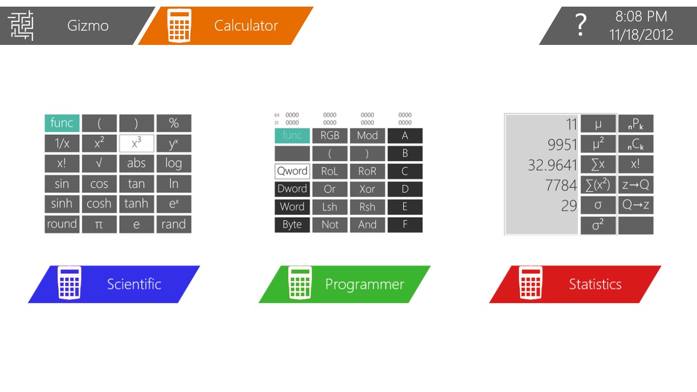 With support for scientific, programmer, and statistics modes, the Calculator Gizmo is the most powerful available on Windows 8! You can even get answers directly in the Windows Search pane or by using the "calc:" protocol to create web links to math forumals (ex: "calc:4*log(2)").