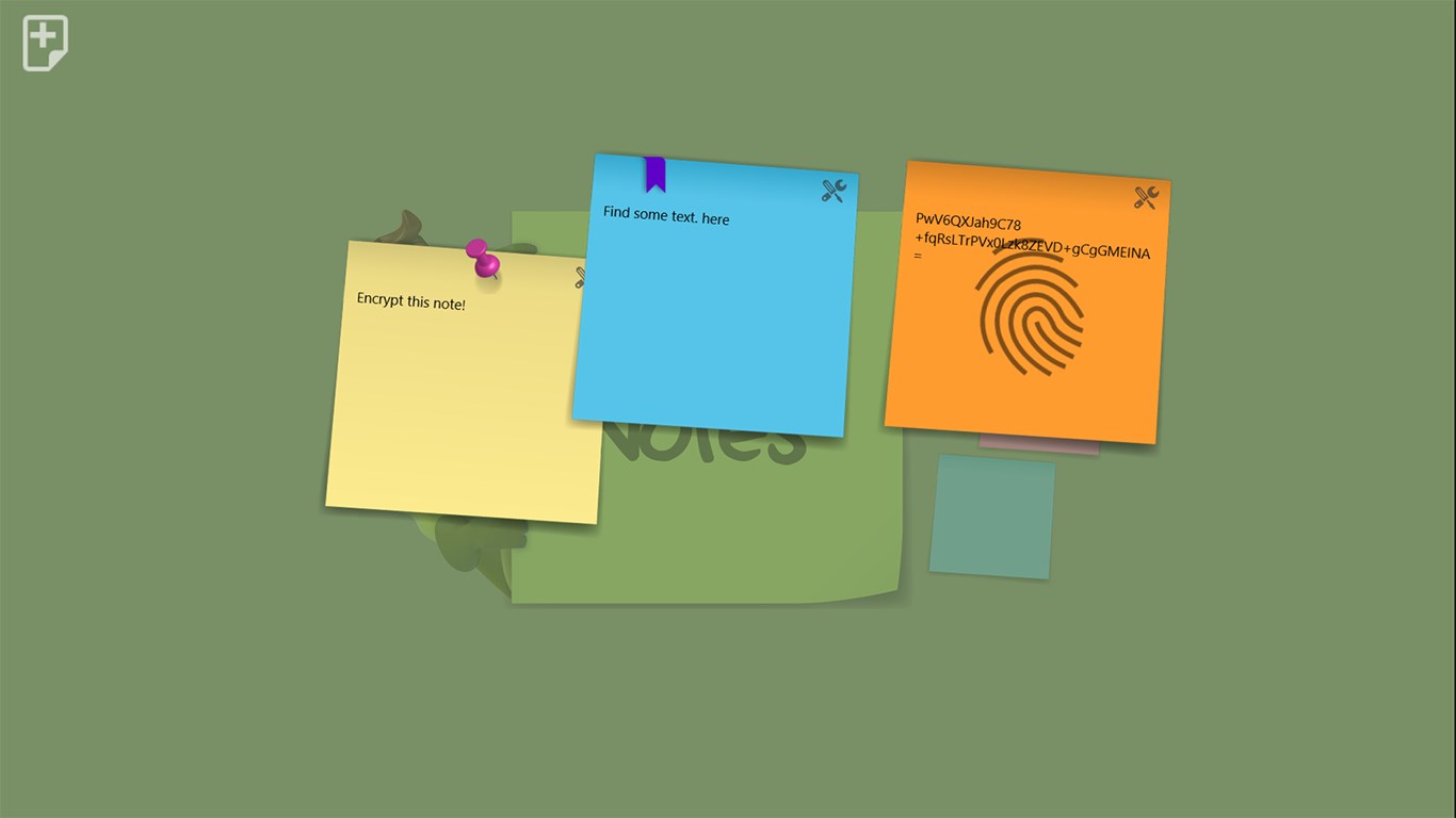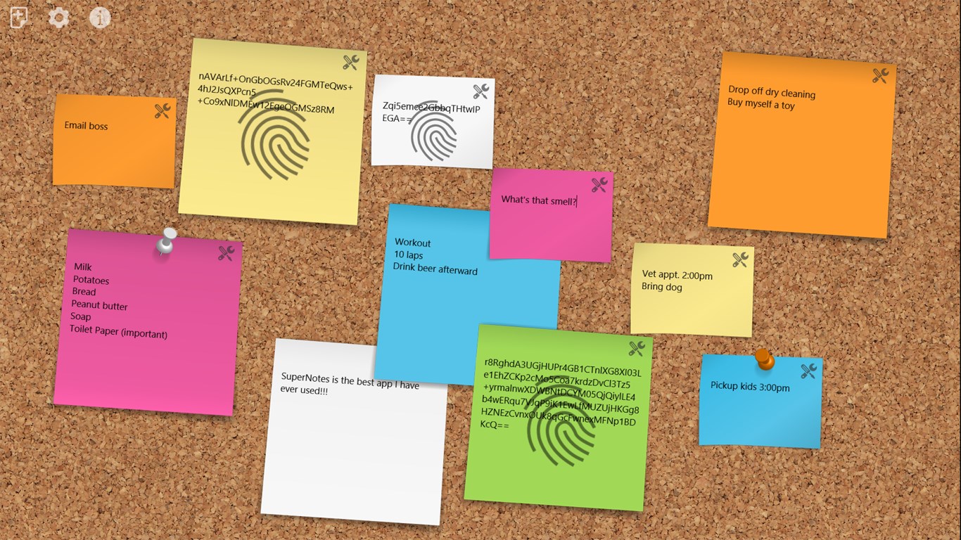 Beautiful Graphical interfaceAbility to Encrypt/Decrypt individual notesNow you can choose your own custom desktop from you photo collection.Email Note dataEasily change any SuperNote Size or ColorMultiple backgrounds to choose from, or choose one from your photo collection!Pin SuperNote to backgroundChoose either a Global or Per-note password for encryption/decryptionStrong Industrial Level encryption algorithmEvery SuperNote is saved automatically...no need to worry about losing data.When encrypted, your SuperNote shows a "fingerprint" indicating that it is intended only for you.Everything is better when you share...so now you can share SuperNotes with Twitter, OneNote, Facebook or any other app that allows sharing.Search through all SuperNotes and bookmark found phrases.Now you can Encrypt or Decrypt ALL SuperNotes with a single button click!Backup/restore notes into an archive fileDRAW on your note and encrypt the drawing!