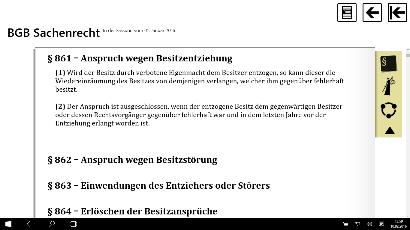 Die Gesetze sind im Gerät gespeichert und jederzeit offline im Zugriff. Mit Touchscreen, insb. Tablets, sind diese so komfortabel nutzbar wie ein Buch. Kostenlos enthalten ist auch der JURION Entscheidungsfinder, der zu Fundstellen die Entscheidungen im Volltext ausgibt.