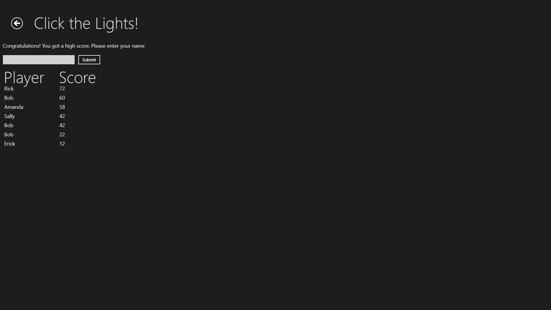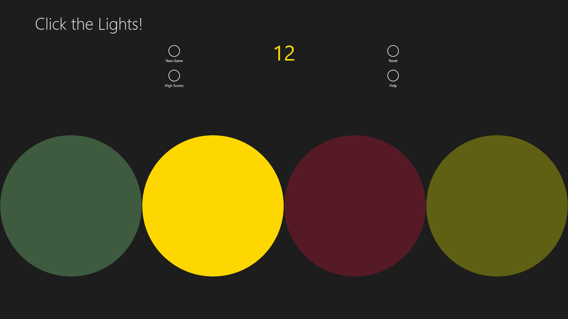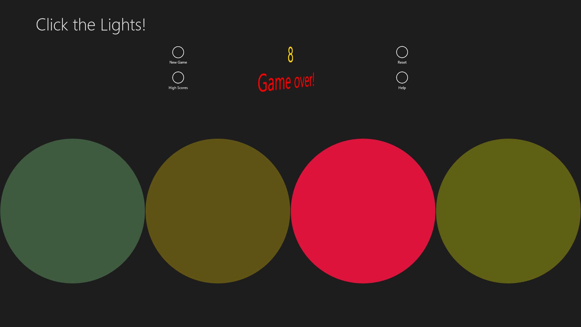 Click the Lights! is an arcade game, where the lights flash in a random order on the screen. Once the light flashes, you need to press it in that order they just flashed. But be careful, more points you get, faster the lights turn on will be, and if you click the wrong light it's gonna be game over! More you play, better you get, so show the game to your family and friends and see if they can beat your high score.