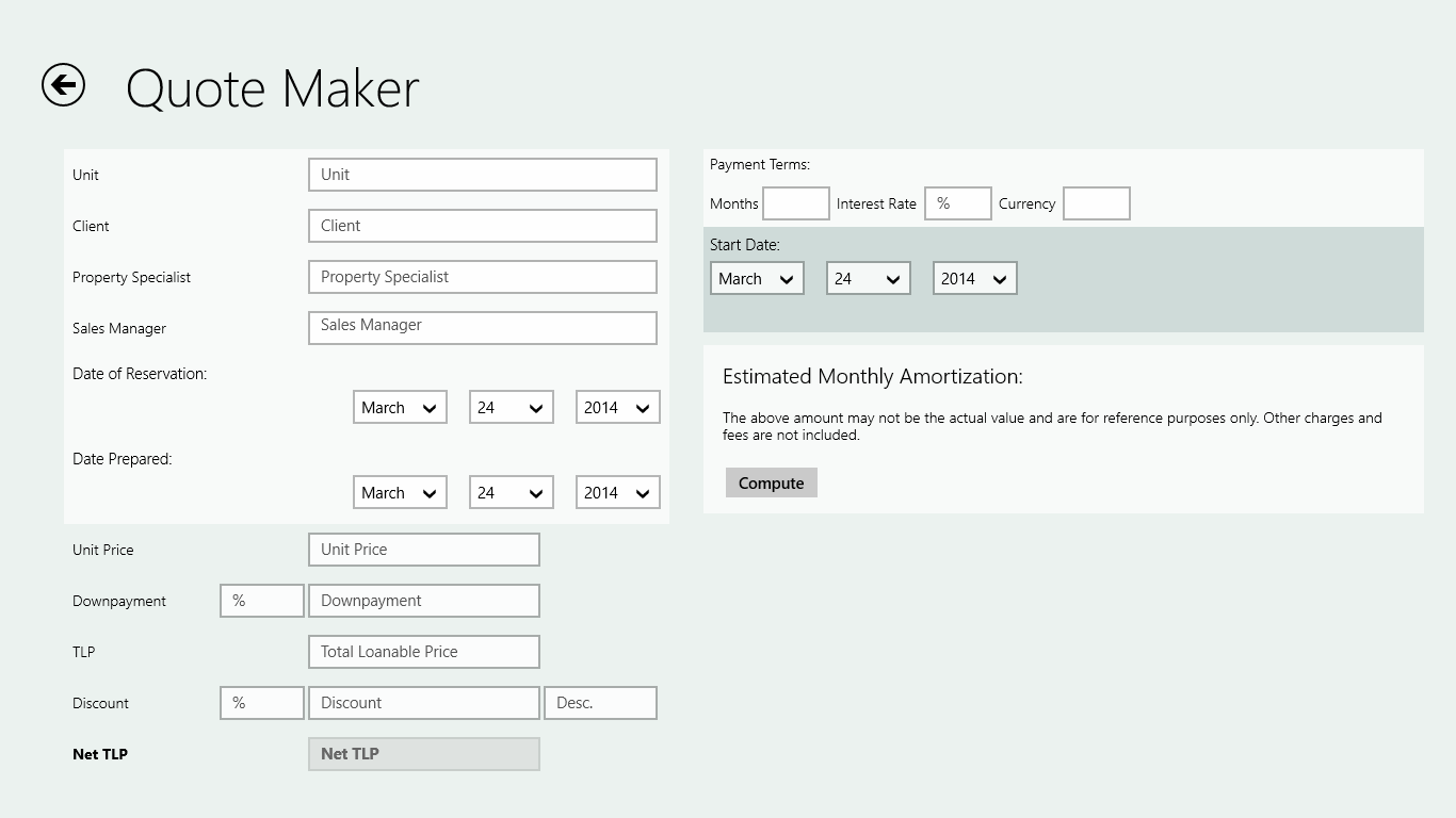 Property Presenter - Create your own property portfolio. Upload images from your PC or using your camera. Browse and search easily through your property listing. View and present property informationTutorial - View the in-app tutorial to get you started.Contact Us - Give us your feedback on how we can improve the app. What features do you want included?Quote Maker - An auto-computation form for generic amortization schemes and payment plans. You can save, load and print previously accomplished computations to quickly respond to client inquiries.