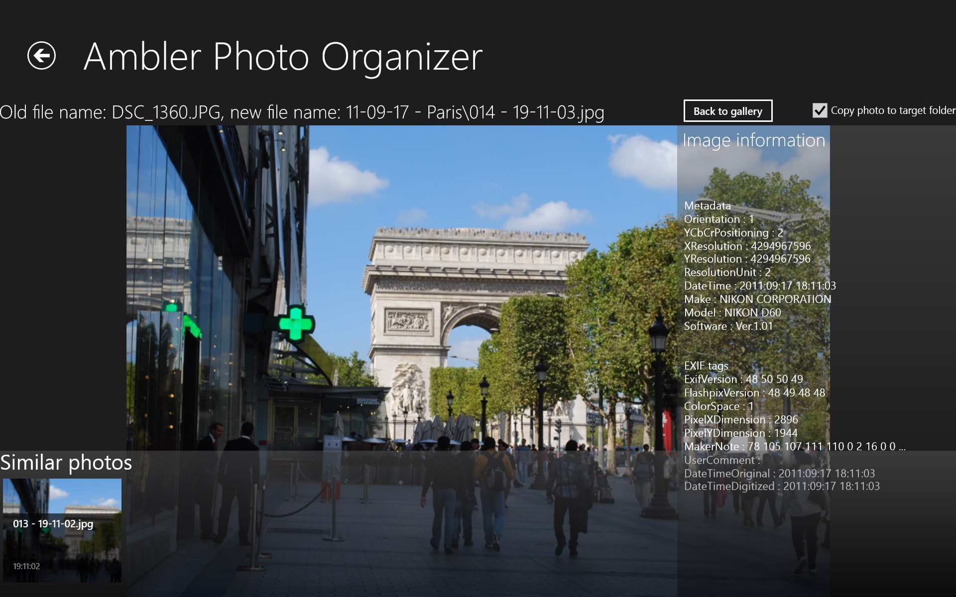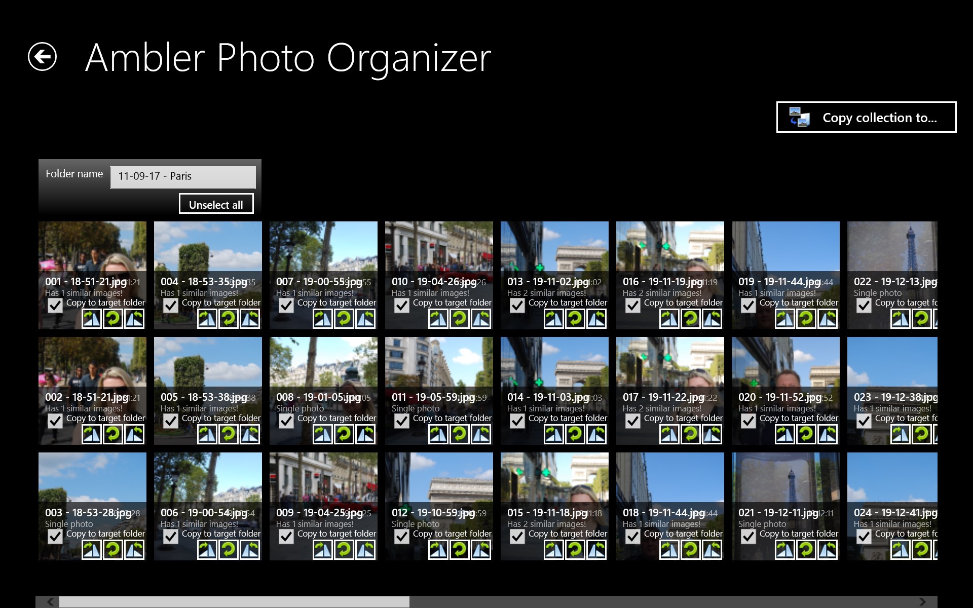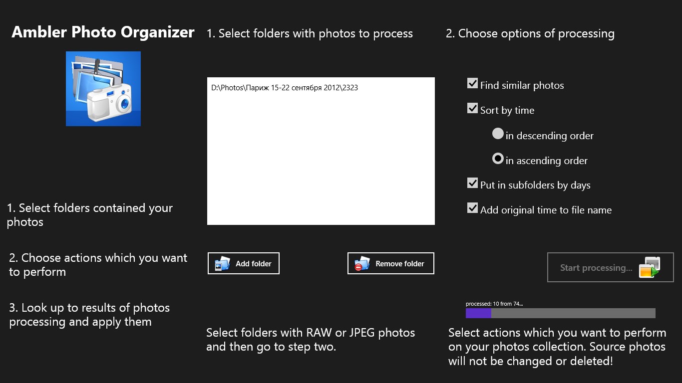 Ambler Photo Organizer was developed for make easy process of copying photos from digital cameras or phones and organization your collections of photos. Do you remember how many time you spend on searching similar photos and rotation of images. You can forget this!