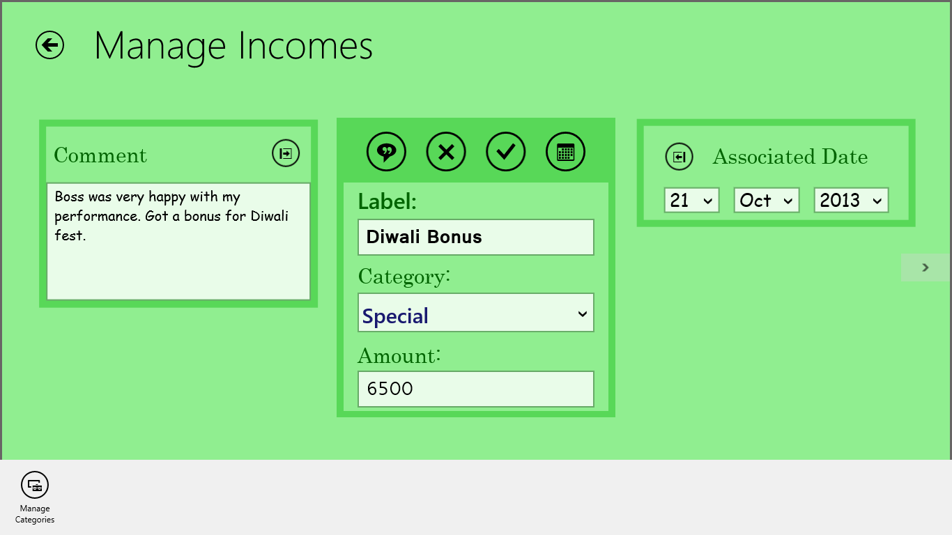 Store all the Income you earn, or Expenses you incure in Record BooksClassify your Income/Expense types into categoriesGet daily, monthly, or yearly reports on each category of your Income/ExpenseReports can be calculated on Time-Span (daily, monthly, yearly), or category wiseProtect your Income/Expense data with a passwordUser friendlyEasy to useCurrency Independent