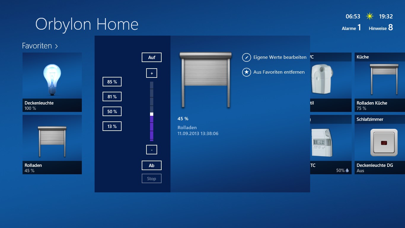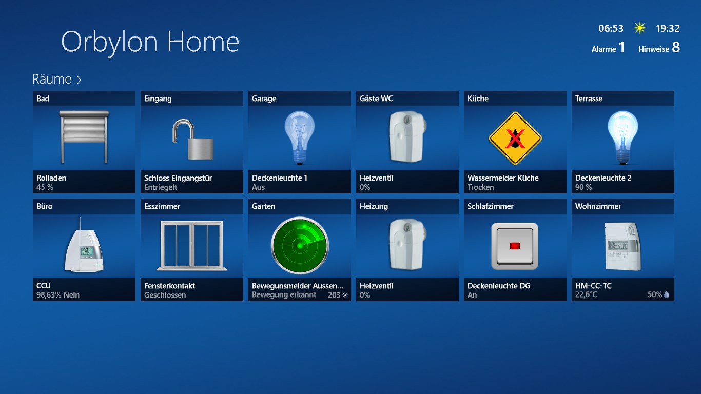 Mit Orbylon Home haben Sie jederzeit Zugriff und Überblick auf die in Ihren Räumen installierten HomeMatic Komponenten der Firma eQ-3. Mit der Touch optimierten Oberfläche können Sie bequem Ihr Haus steuern und überwachen.