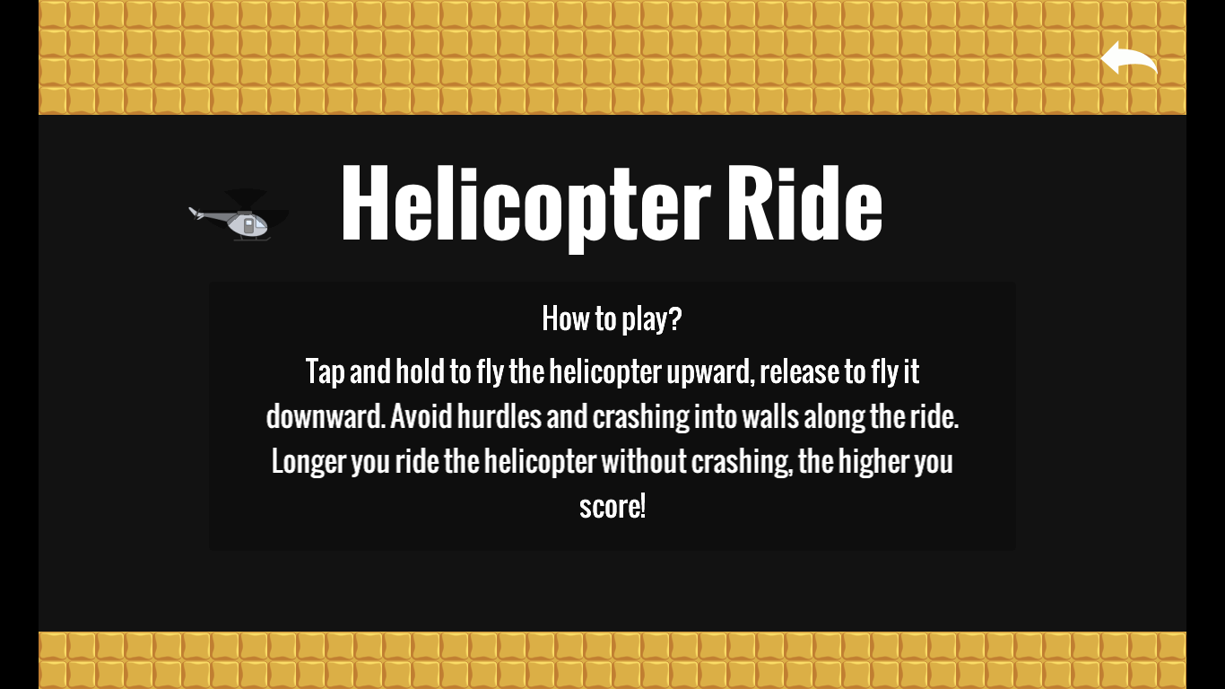 Tap and hold to fly the helicopter upward, release to fly it downward. Avoid hurdles and crashing into walls along the ride. Longer you ride the helicopter without crashing, the higher you score!