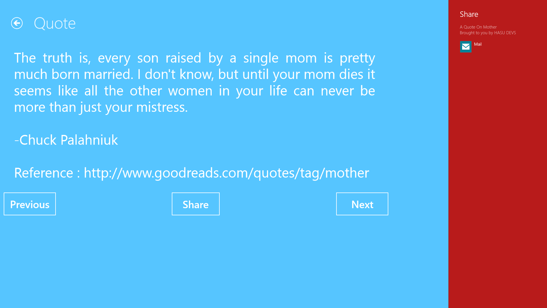This app is dedicated to mothers and people who want to read about mothers. It provides quotes on mother from several authors in a single place with references. Users can read and think of perhaps the most beautiful person in their life - MOTHER.