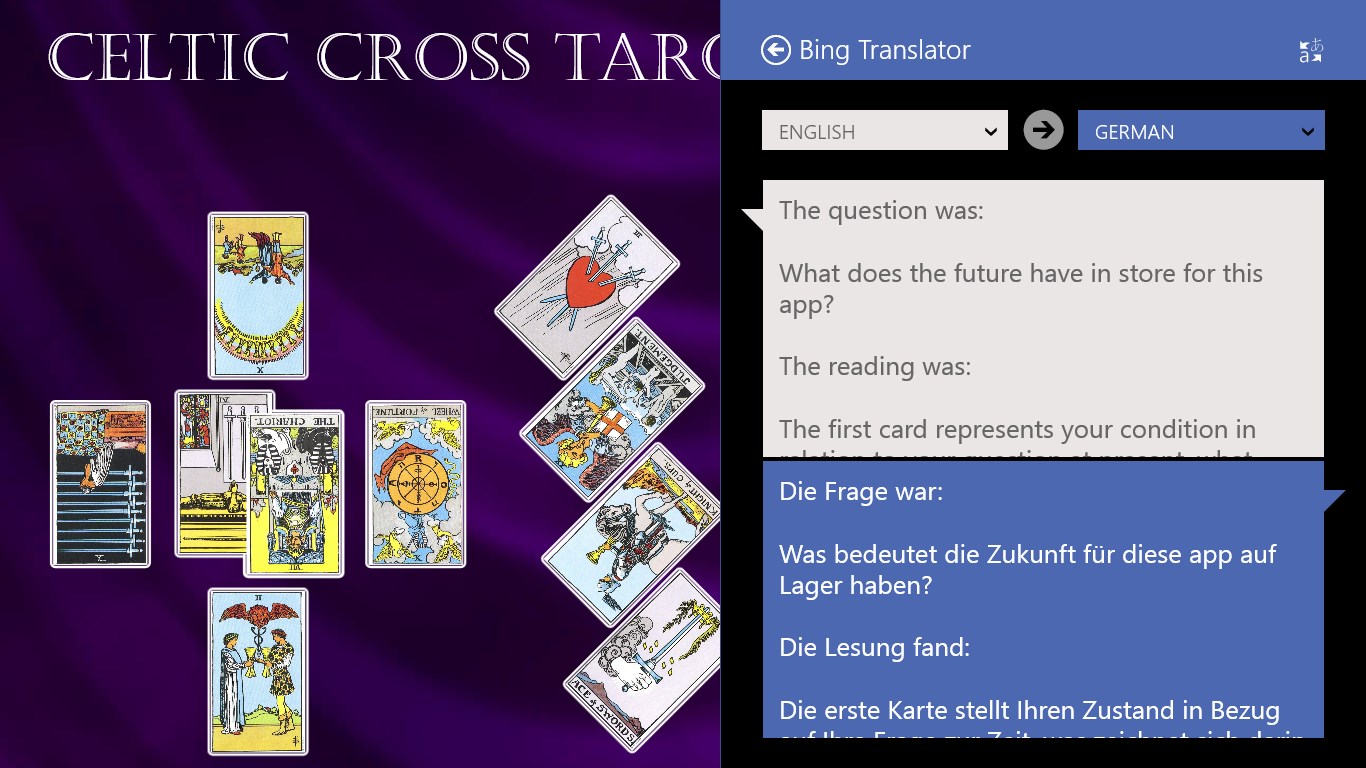 No previous knowlege of the Tarot is required.The app allows you to share the result of the reading through the share charm so you can keep it for further reference.Celtic Cross uses the classic Rider-Waite tarot deck.
