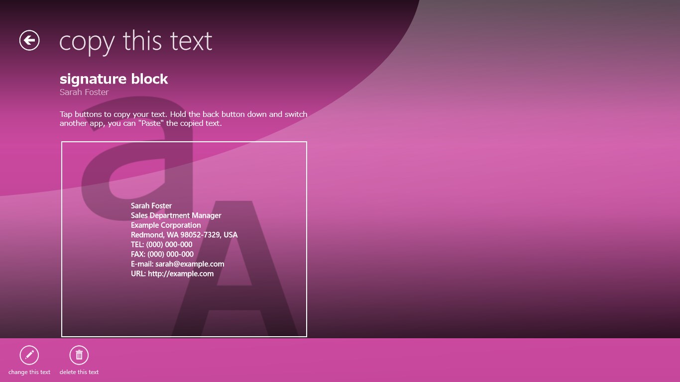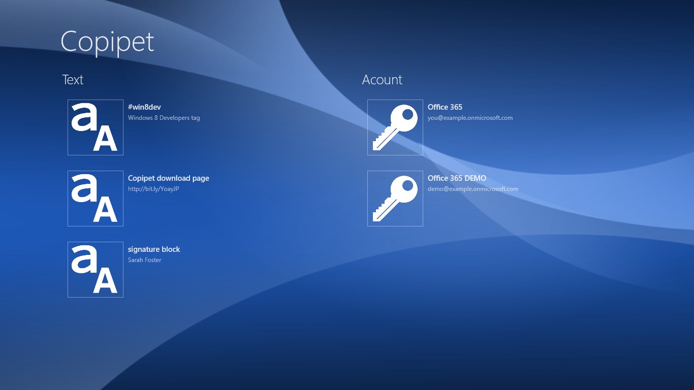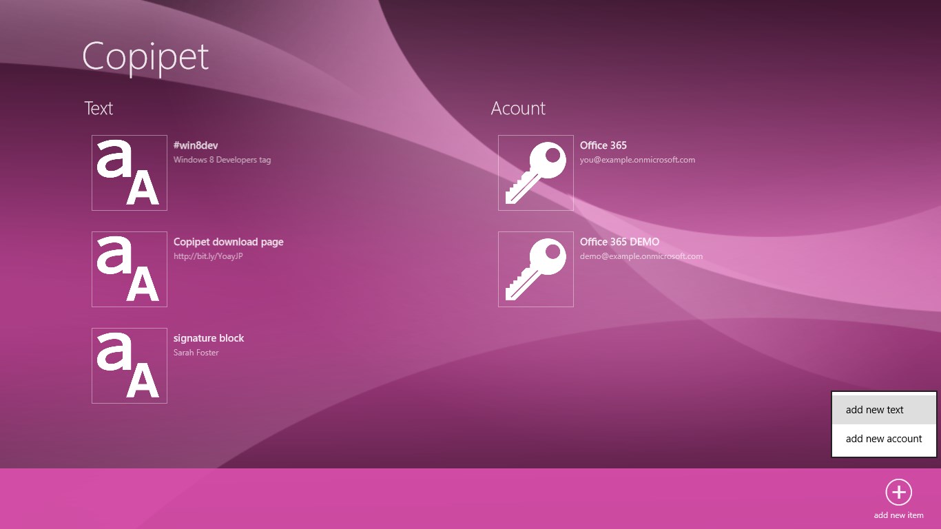 You can store many texts to this app, and paste those texts easily when you need.you can store account name, password and URL with a set. You can sign-in, by "Copy & Paste".