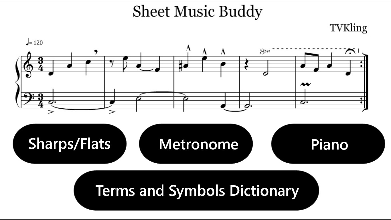 Metronome from 40 - 200 BPMSharps/Flats reminder give a key signatrueSingle Octave of a Piano useful for tuning and finding a certain pitch*NEW* Terms and Symbols Dictionary - great for figuring out what those weird looking symbols meanMulti-Language support