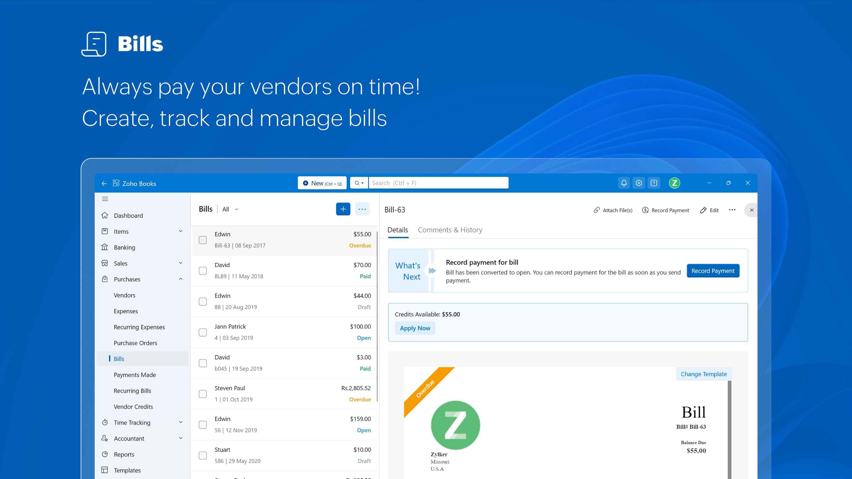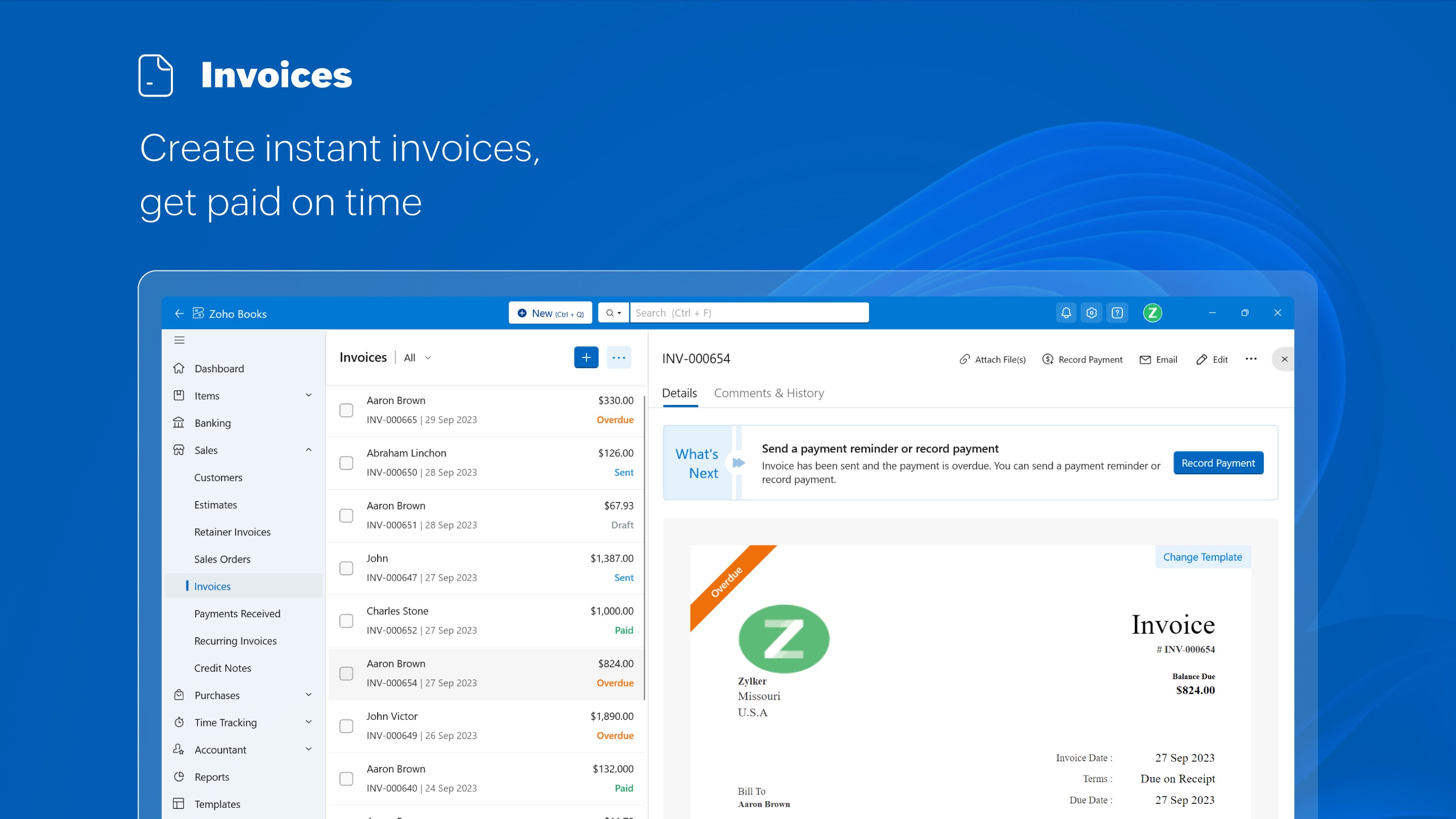 Payments are simplified as you can record payments effortlessly and collect payments faster using Payment Reminders. Automation features like payment reminders help you save time and focus on your business.