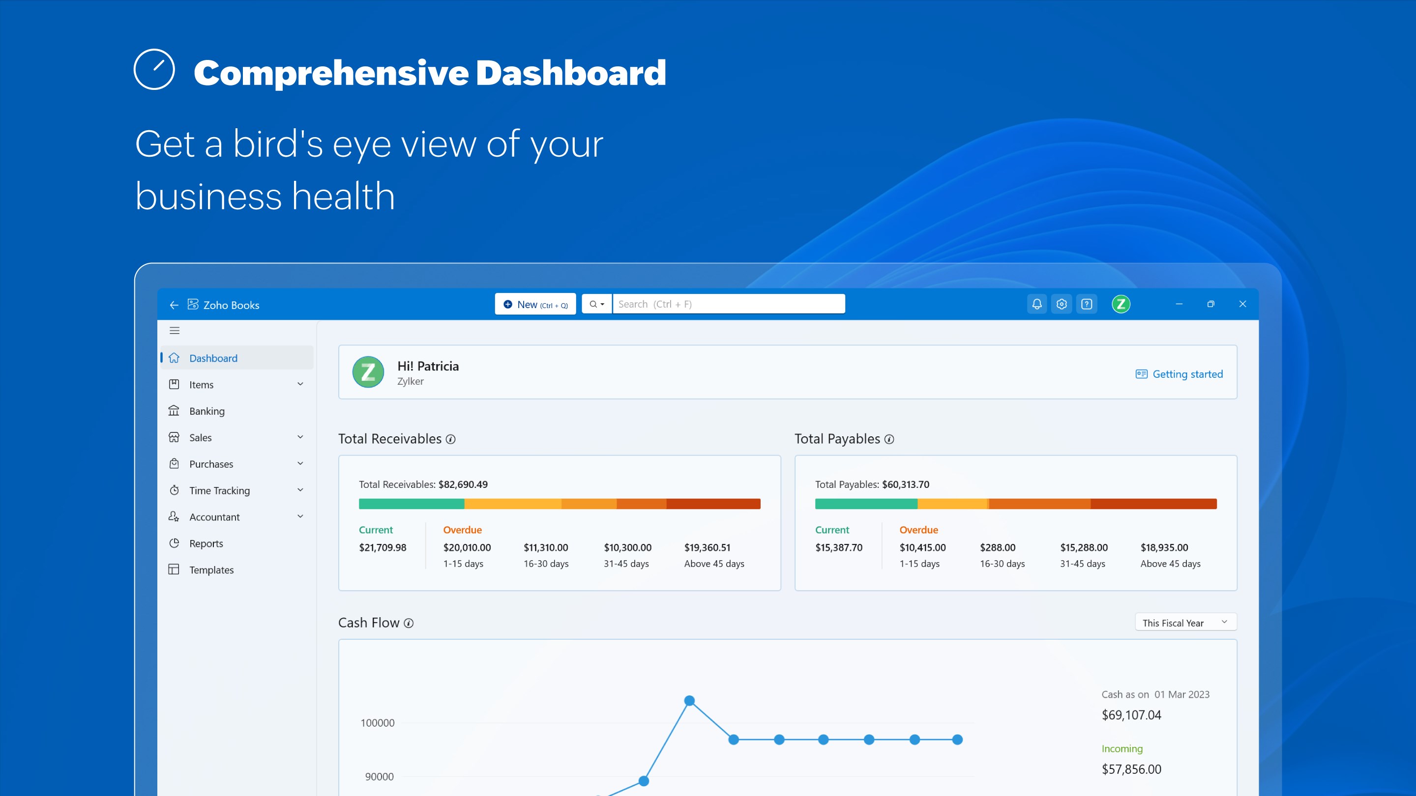 Zoho Books is the smart, end-to-end online accounting software for your business. You can record all your sales and purchase transactions, set payment reminders and collect payments on time. Also, you can track your income and expenses easily.