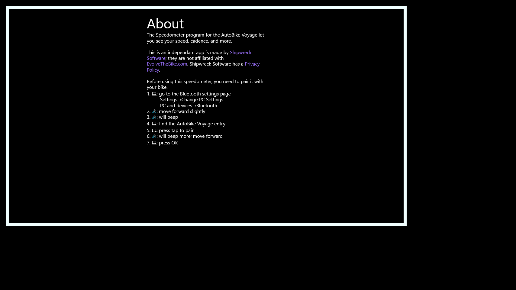 Works with the AutoBike Voyage bicycle from evolvethebike.comDisplays a speedometer, your cadence, the current gear, and moreYou can pick the meters to show on the screenConnects via BluetoothAvailable for Windows and Windows Phone