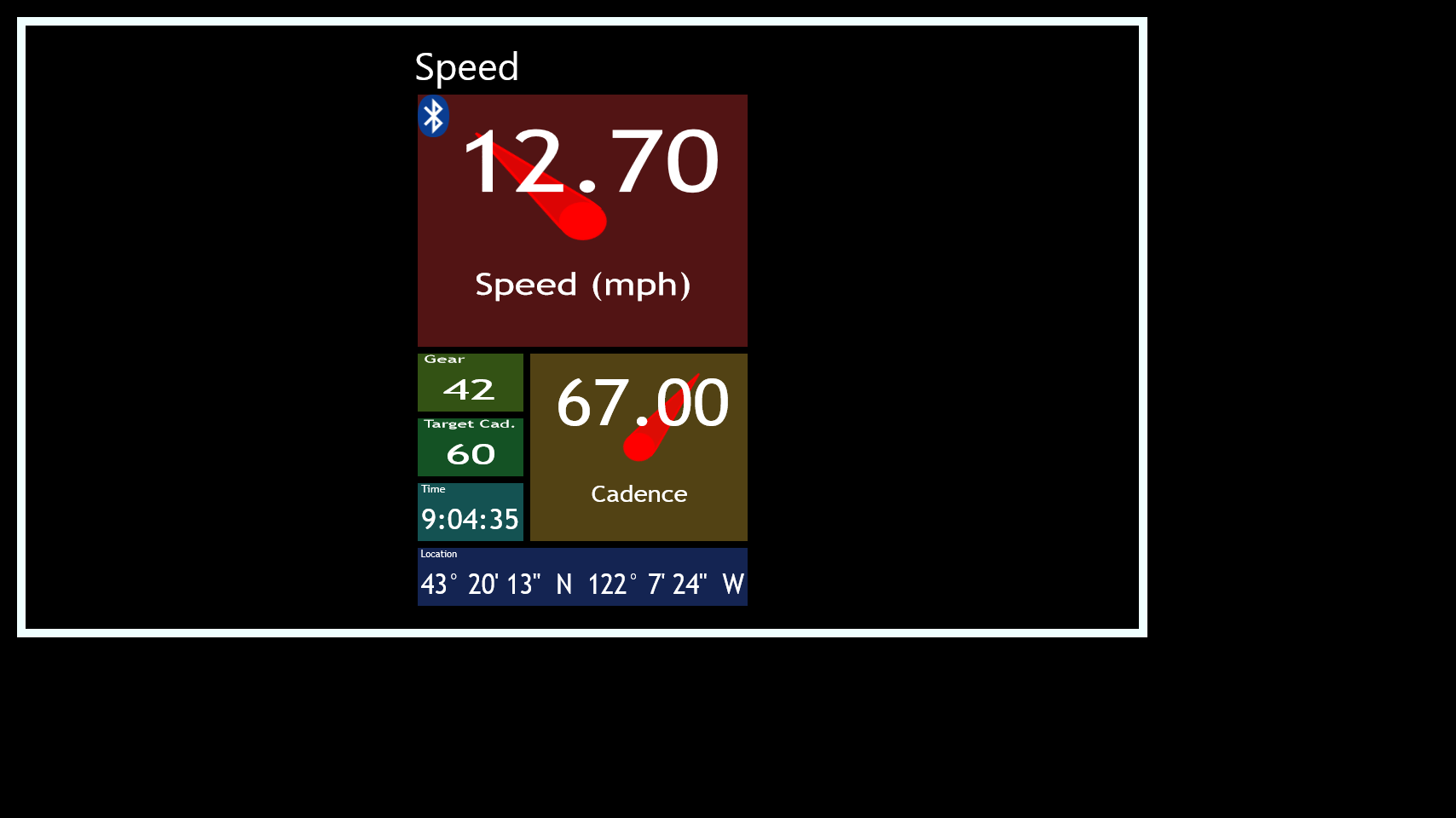 The Speedometer for AutoBike Voyage is a program I wrote to be my new speedometer. It shows you your current speed and cadence, the current gear that you're in, and more.