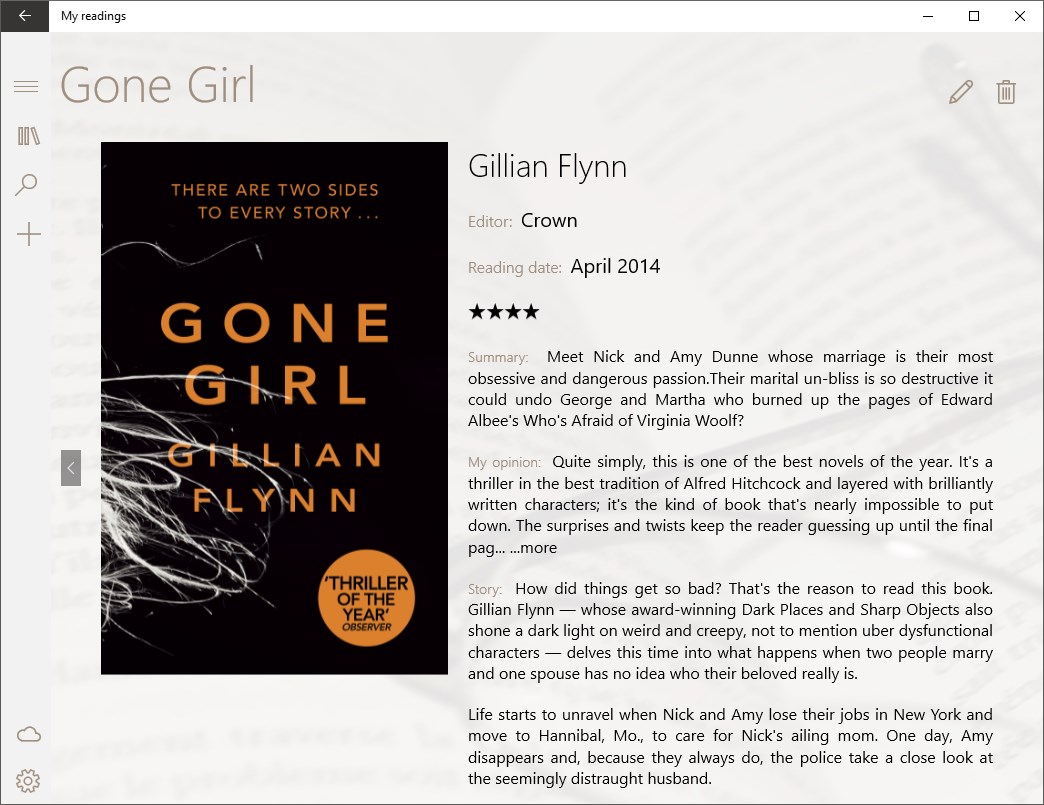 "My readings" is a book list manager. Once you read a book, you can create an entry in the application and add a summary, your opinion, the book cover, the reading date,...