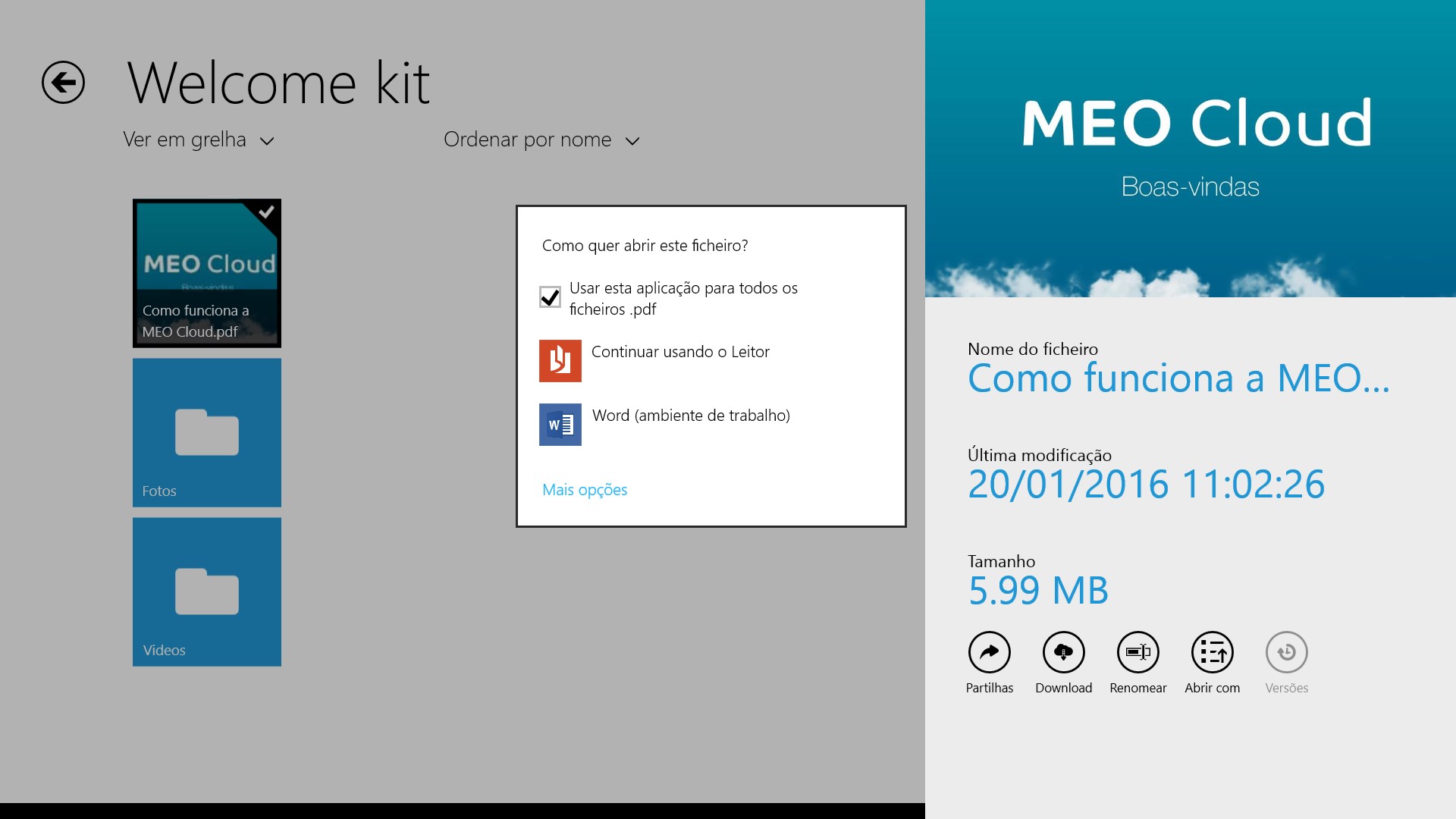 A MEO Cloud é um serviço de alojamento e sincronização que lhe permite manter os ficheiros seguros e acessíveis a partir de qualquer dispositivo (PC, tablet ou smartphone).