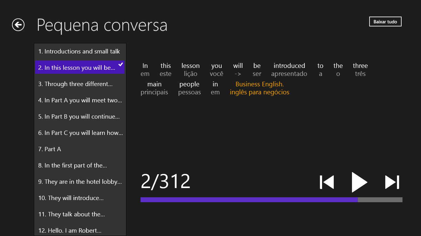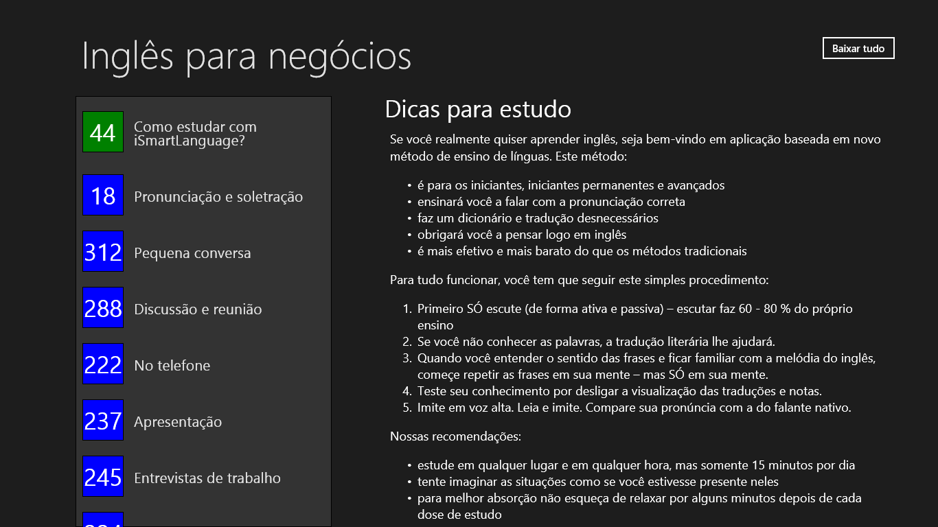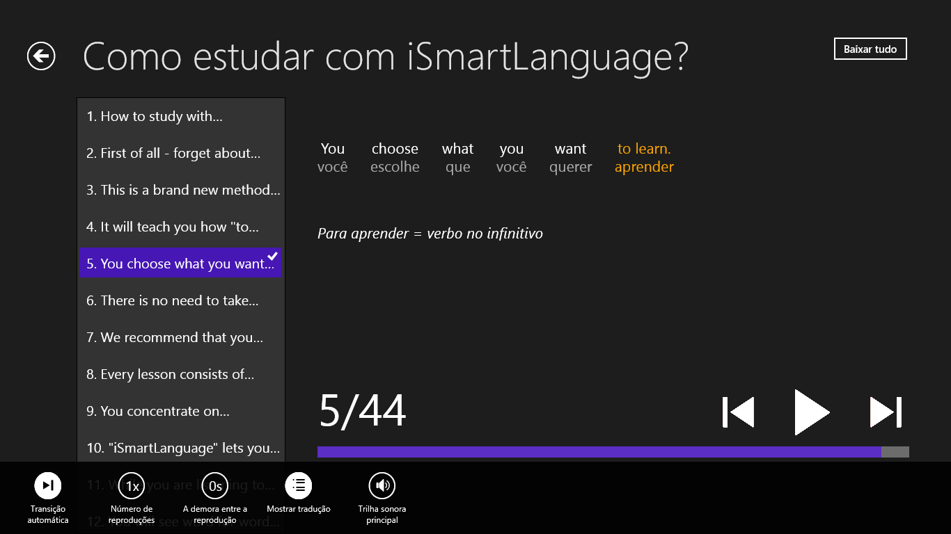 Aprenda 5 vezes mais rápido que com os métodos convencionaisa reprodução de frases em forma de karaokê (o que eu ouço, eu vejo)a tradução literal com as notas (não precisa de um dicionário)o método de ensino eficaz Imitum® - mais sobre o método em www.imitum.commais sobre o aplicativo em www.smart-language.com