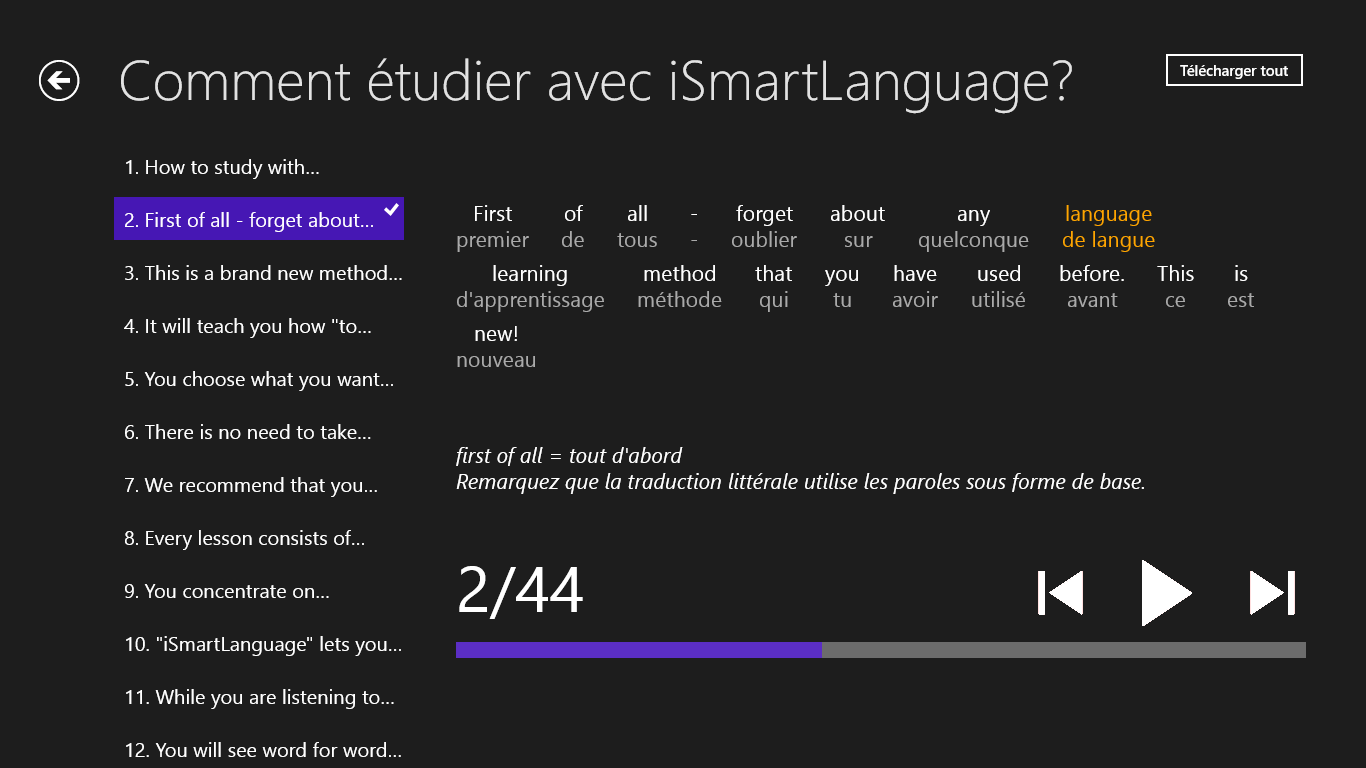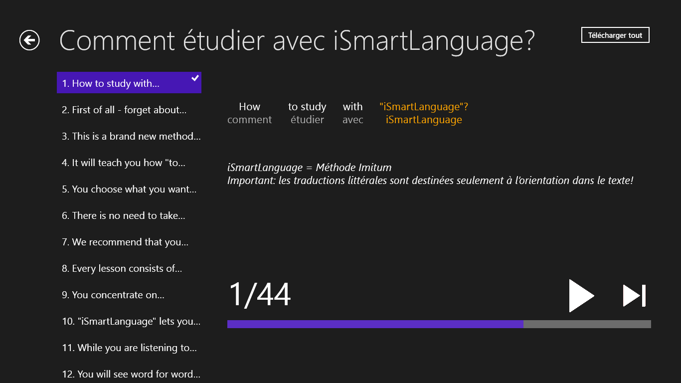 apprenez 5x plus vite que par les méthodes habituellespasser les phrases par la méthode « karaoké » (ce que j\’entends, cela je voie)traductions littérales avec les notesenseignement par la méthode efficace Imitum® - plus d\’information sur la méthode sur www.imitum.complus d\’information sur l\’application sur www.smart-language.com