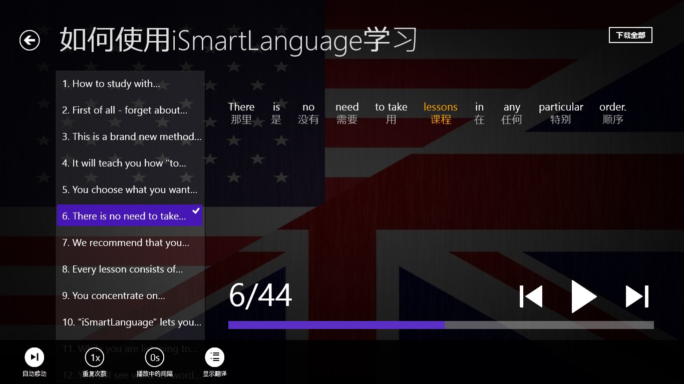 比普通方式学习效率提高5倍用卡拉OK方式播放所有音频(我听到的,我看得到)直译加备注(不需字典)通过Imitum®方法有效学习 – 更多介绍请查询www.imitum.com更多应用程序请查询www.smart-language.com