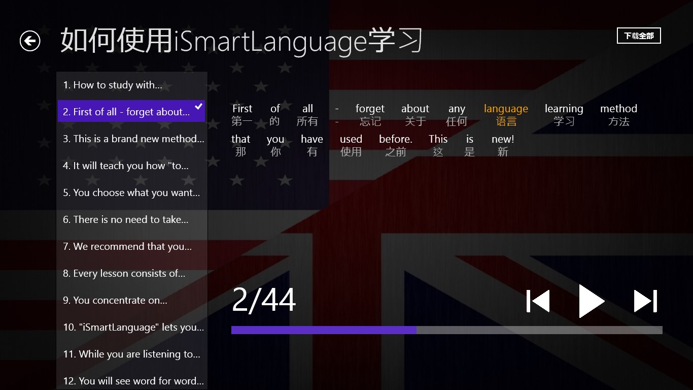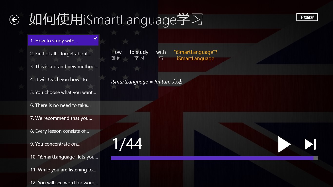 比普通方式学习效率提高5倍用卡拉OK方式播放所有音频(我听到的,我看得到)直译加备注(不需字典)通过Imitum®方法有效学习 – 更多介绍请查询www.imitum.com更多应用程序请查询www.smart-language.com