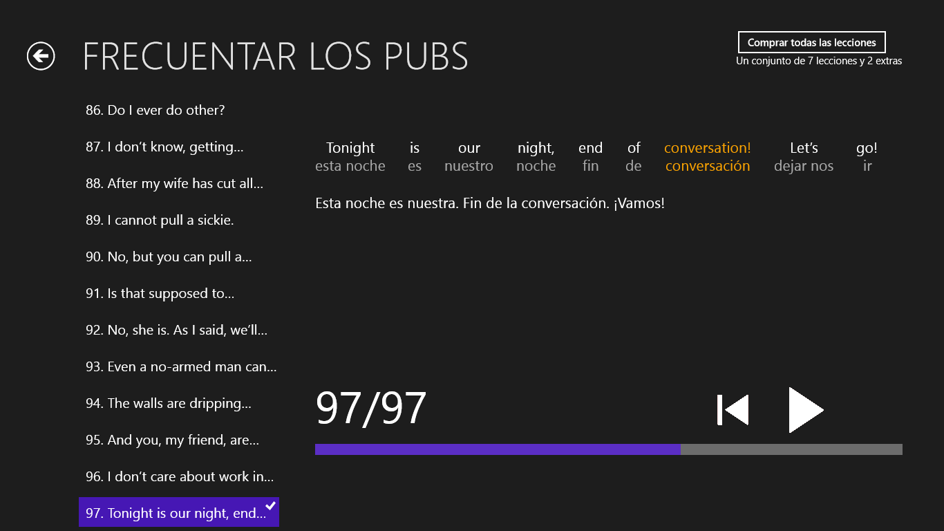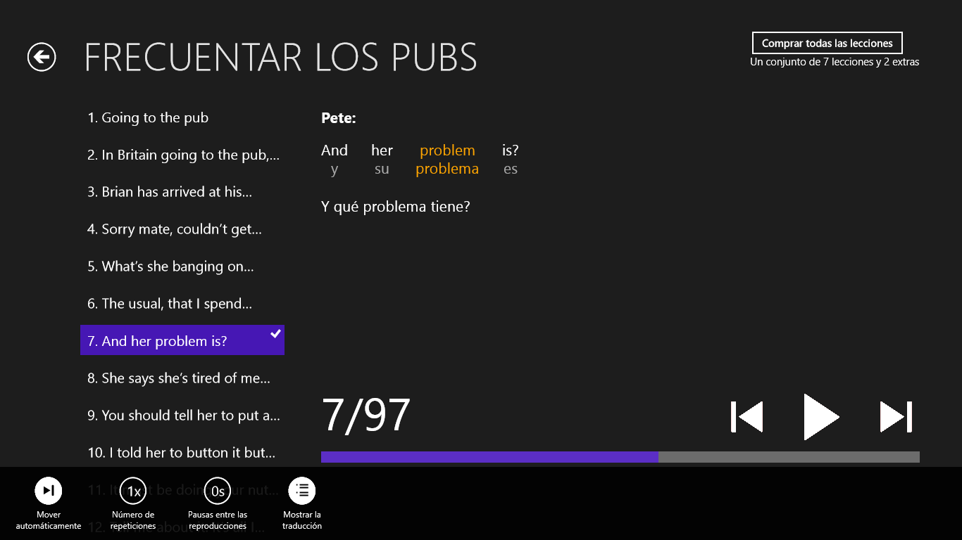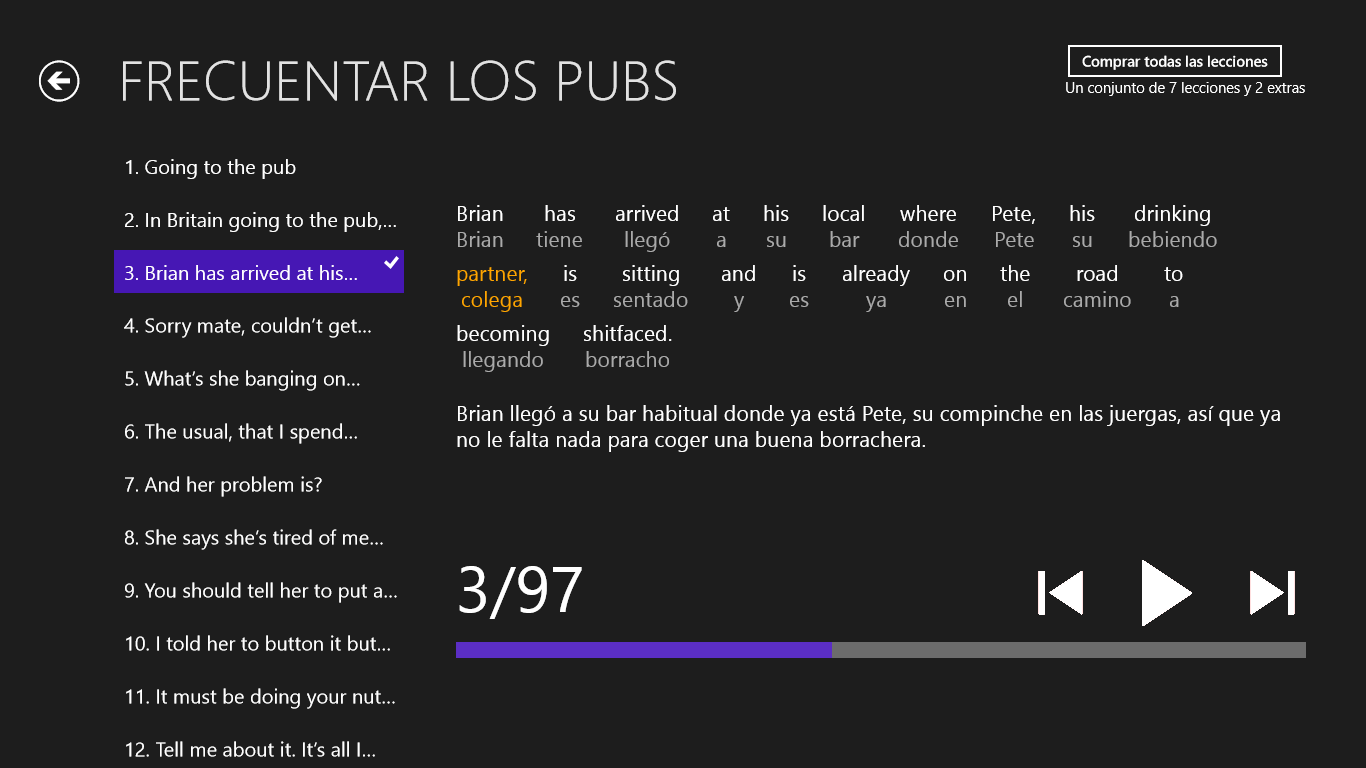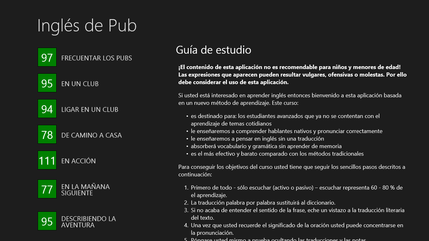 aprenda 5 veces más rápido que con un método tradicionalreproducción de las oraciones en formato para \“karaoke\” (lo que estoy escuchando, lo estoy viendo)traducciones literales con notasmás sobre la aplicación en www.pub-english.com
