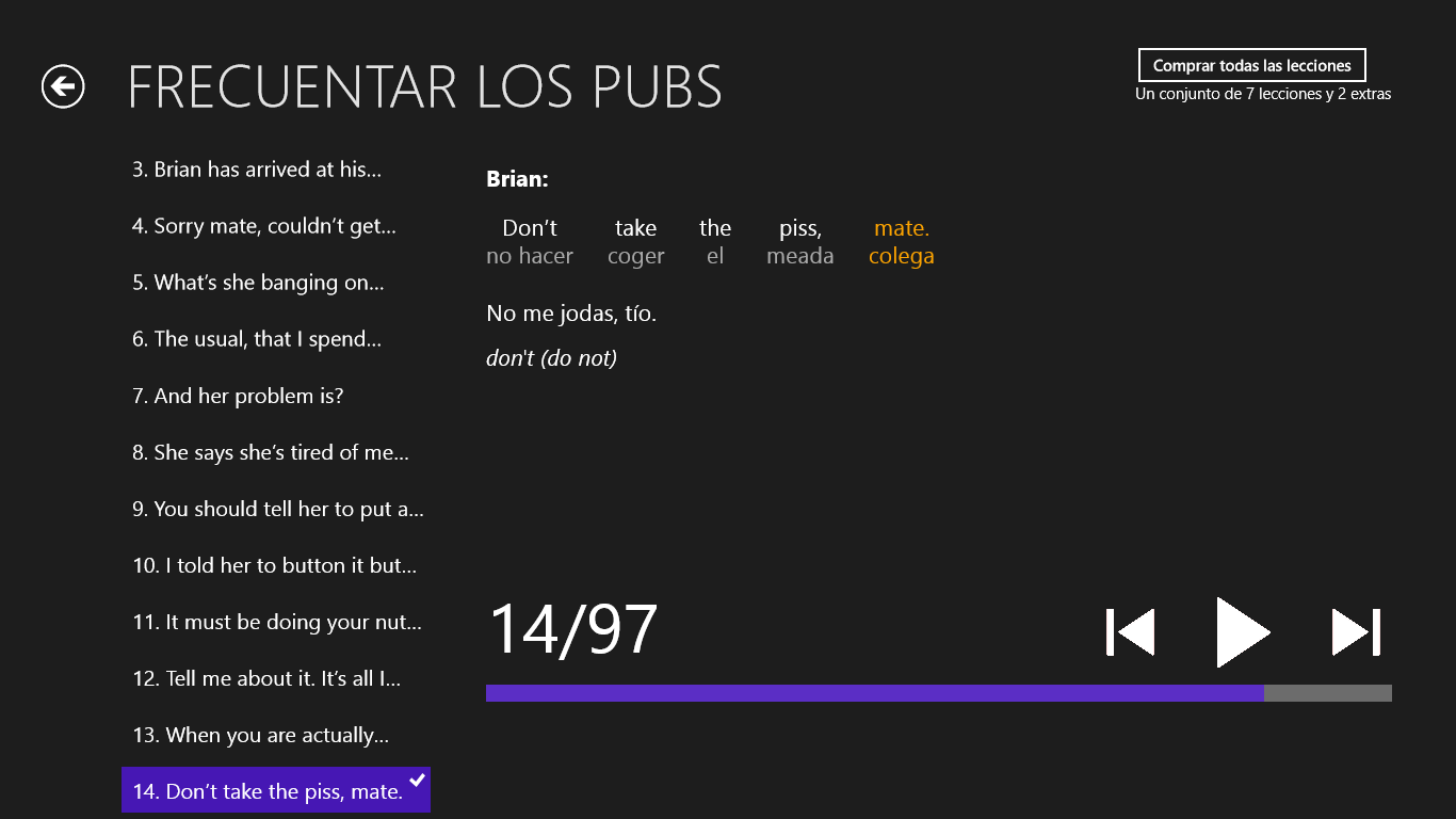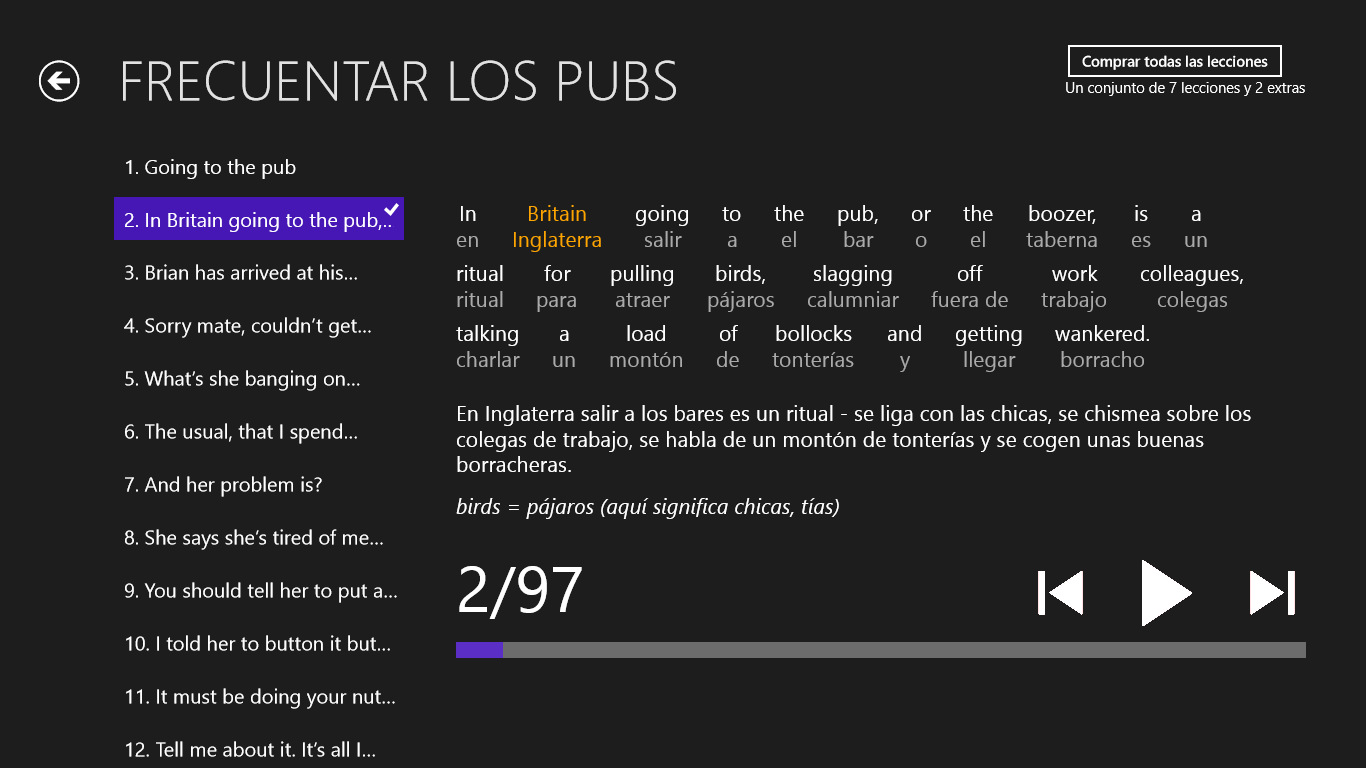 Cada lección contiene un rico vocabulario que forma parte de una historia concreta. Estudiarán temas como: las típicas charlas en un pub, cómo organizar una borrachera, métodos para ligar en un bar y cómo concluir la conquista ya en privado...