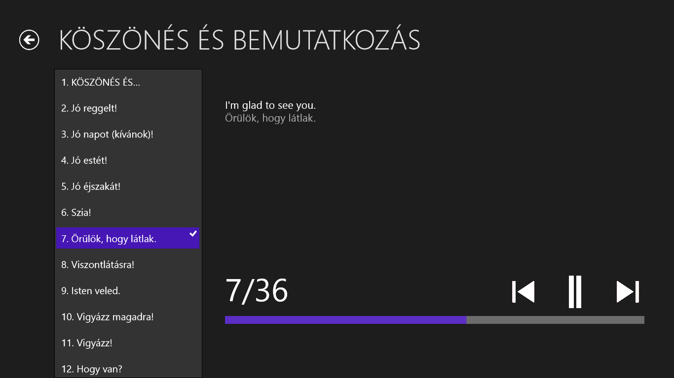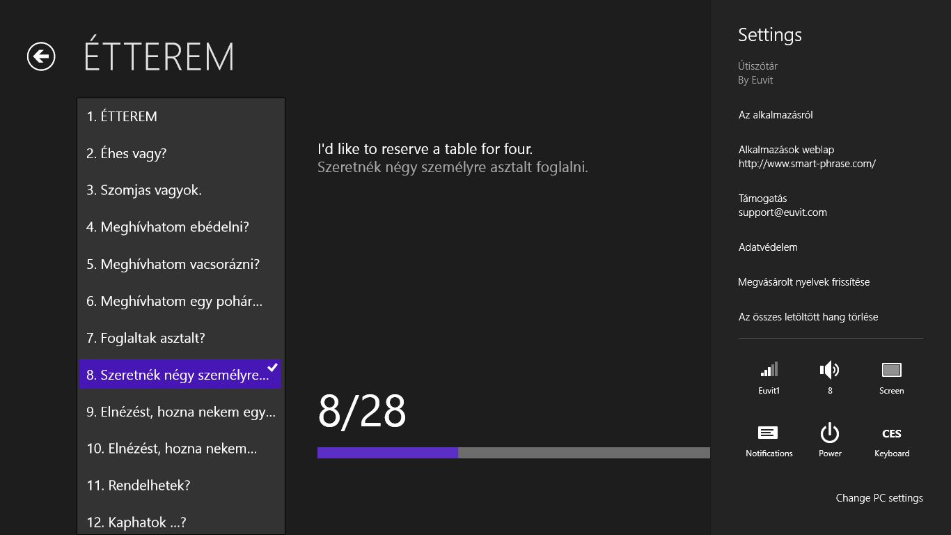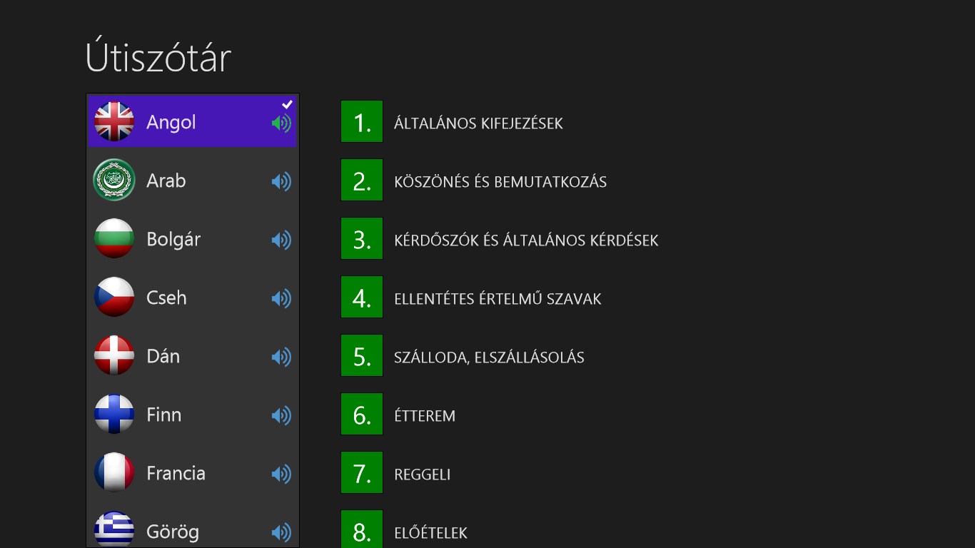 Az egyes témák mondatokat (kifejezéseket vagy szavakat) tartalmaznak, melyeket anyanyelvi beszélők készítettek el. A témák tartalma kiterjed a leggyakoriabb helyzetekre, amelyek önre utazásai során várhatnak. A mondatokat nem csak elolvashatják, de meg is hallgathatják, így a kiejtés begyakorlása gyerekjáték lesz. Ha mégsem mer majd beszélni, akkor sincs semmi baj, elég, ha a mondatot hangosan lejátssza, és az alkalmazás ön helyett fog „beszélni”.
