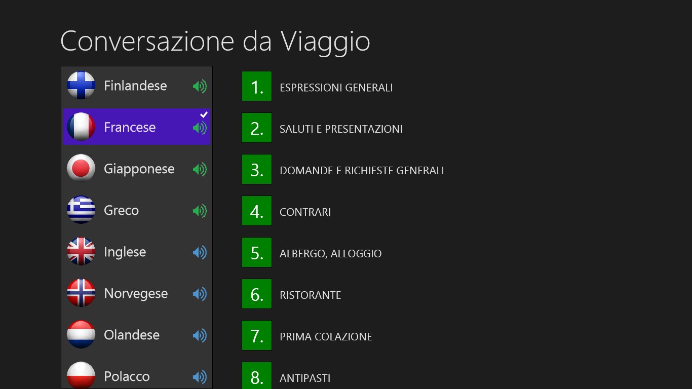 Ogni tematica contiene frasi (espressioni oppure singole parole) preparate dai madre lingua dei rispettivi paesi. Il contenuto delle tematiche riguarda le situazioni più frequenti che potete incontrare nel corso di un viaggio. Non solo potete leggere queste frasi, ma soprattutto ascoltarle! In questo modo esercitare la pronuncia sarà come un gioco. Se però non vi azzardate proprio a parlare, basta registrare una frase ad alta voce e l’applicazione “parlerà” al posto vostro.