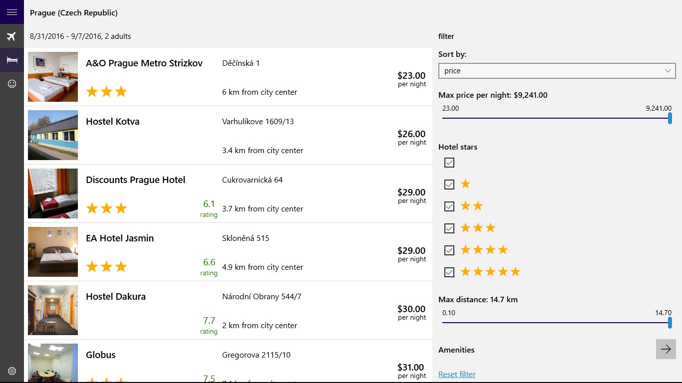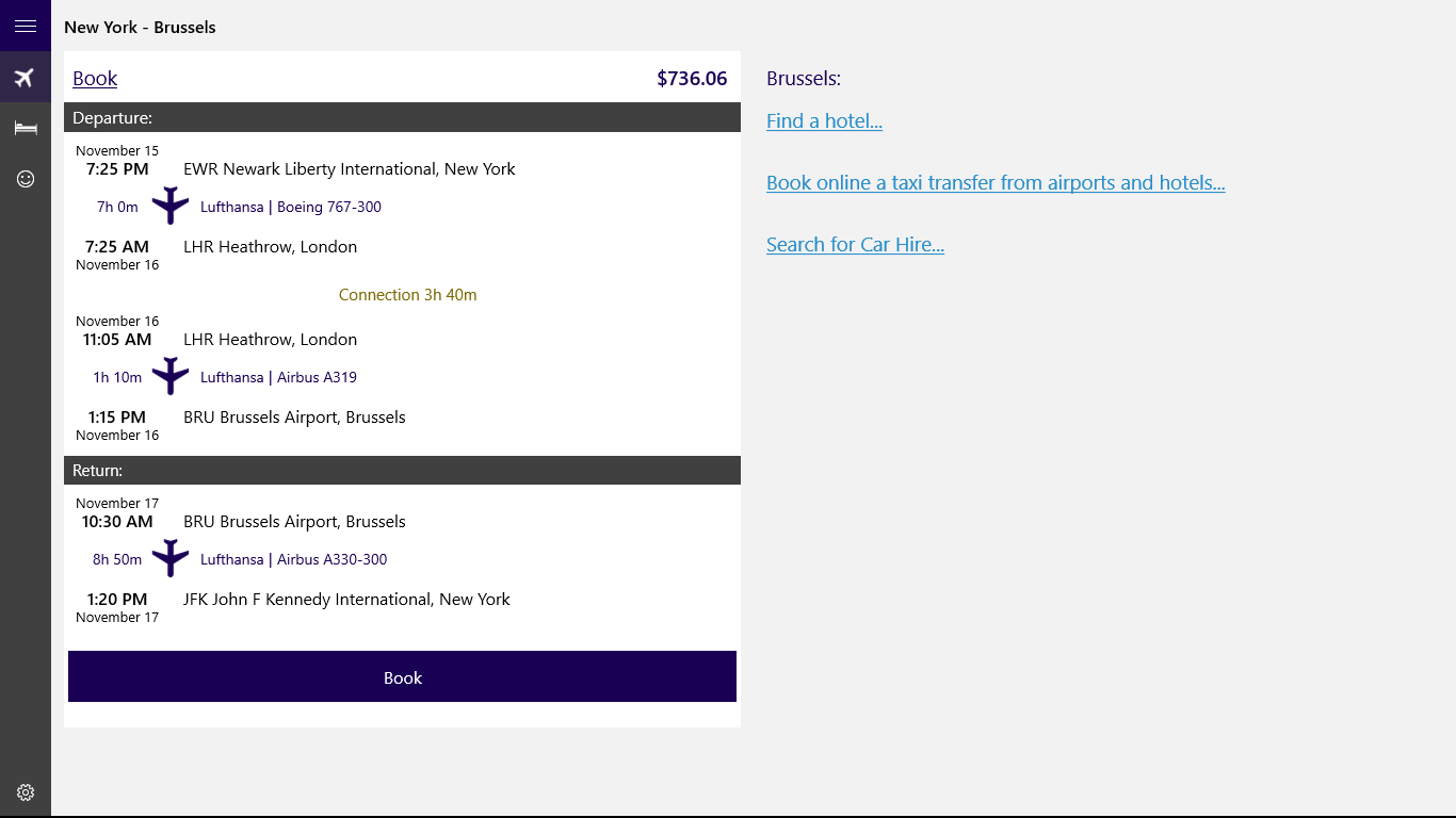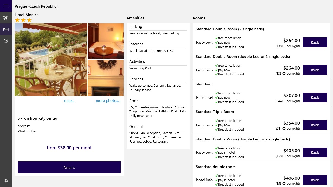 Get total information about flight including type of aircraft. View hotels photos and location on map.