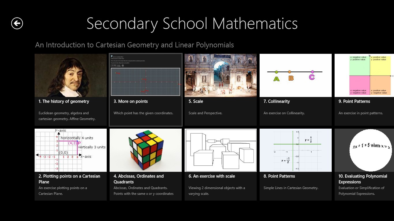 Secondary School Mathematics. This is the first in a series of applications built around the secondary school mathematics curriculum. This application contains three chapters. The first is an Introduction to Cartesian geometry. The second is a complete discussion on linear polynomial expressions, equations and functions, whereas the third chapter is a complete discussion of quadratic expressions, equations and functions.