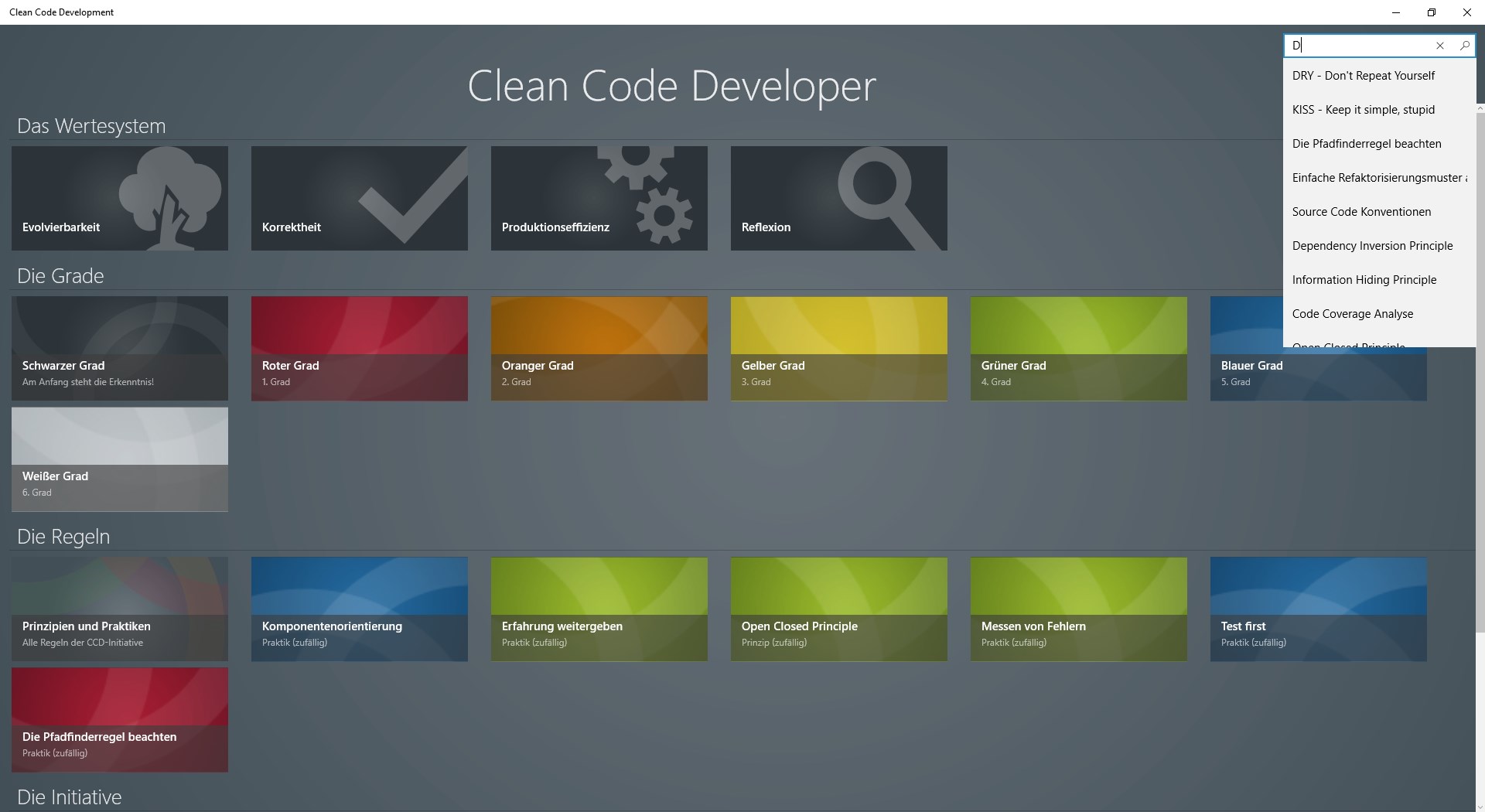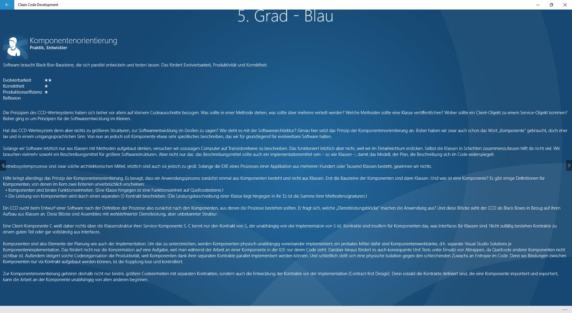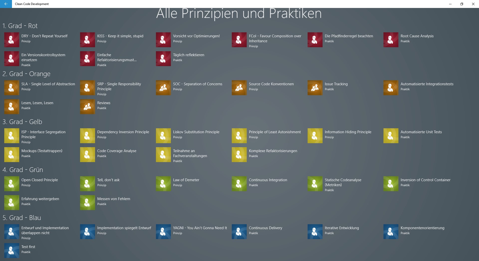 Die Clean-Code-Developer-App enthält eine Einführung in das Thema Clean Code Development (CCD), informiert über die CCD-Initiative und bietet eine Übersicht über die verschiedenfarbigen Grade und die dazugehörigen Prinzipien und Praktiken. Die App kann als mobiles Nachschlagewerk oder als Leitfaden von überall und auf jedem beliebigen Endgerät genutzt werden. Die verschiedenfarbigen Lernmodule unterstützen Softwareentwickler dabei, die Regeln und Werte zur Steigerung von Softwarequalität zu verinnerlichen und im Programmieralltag anzuwenden.