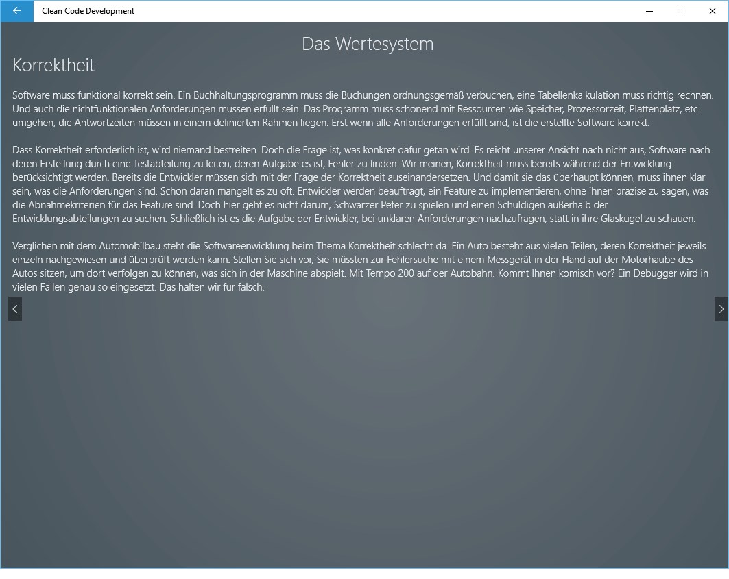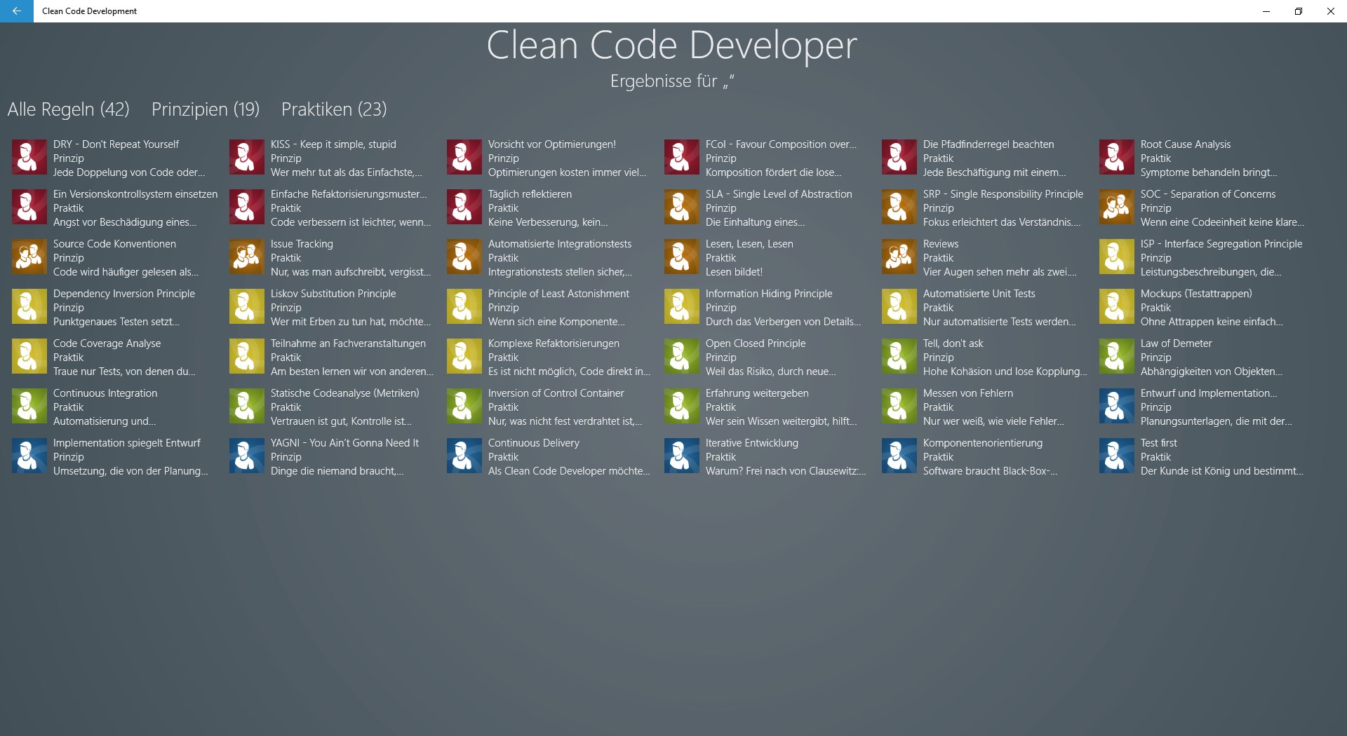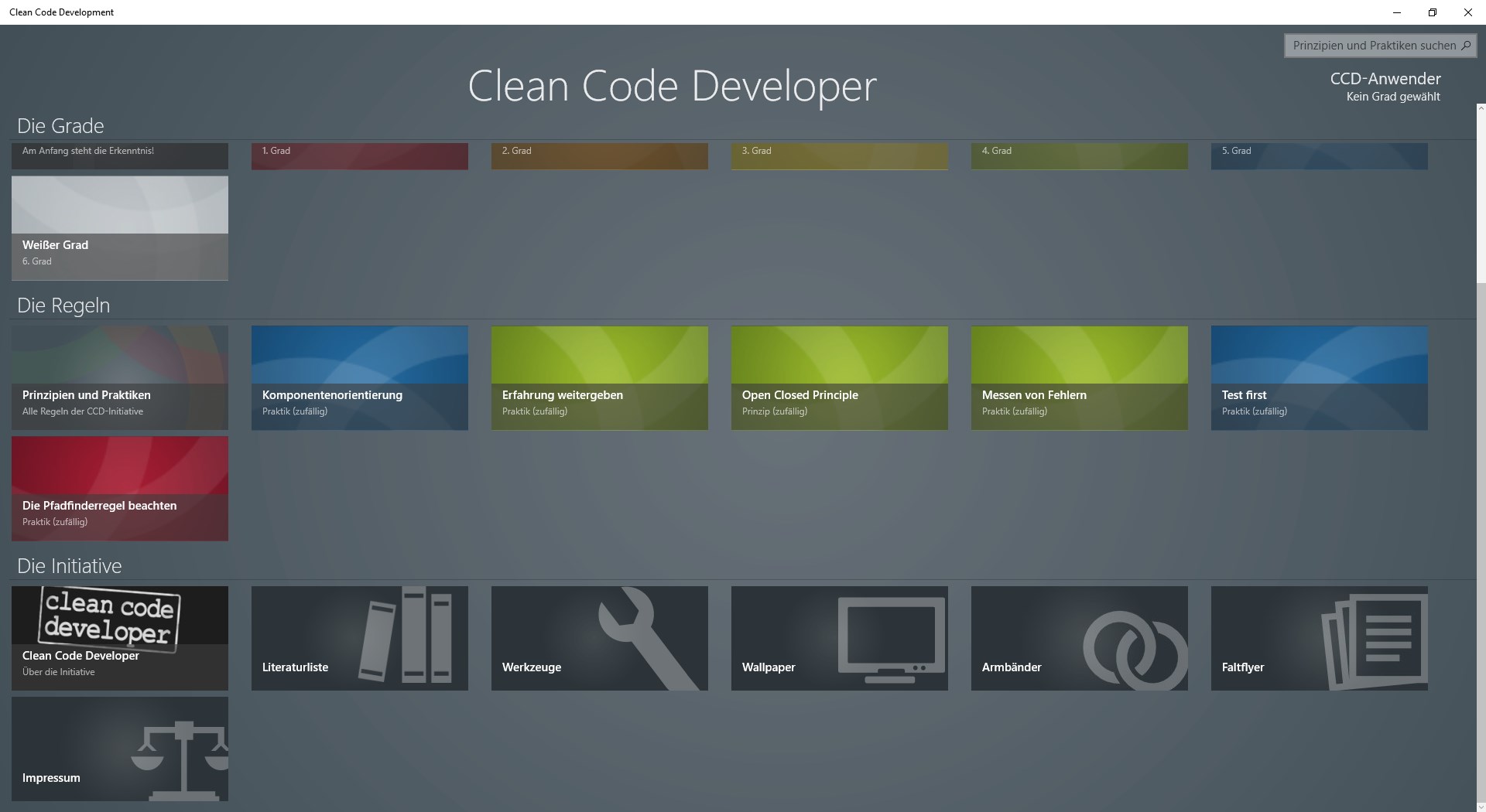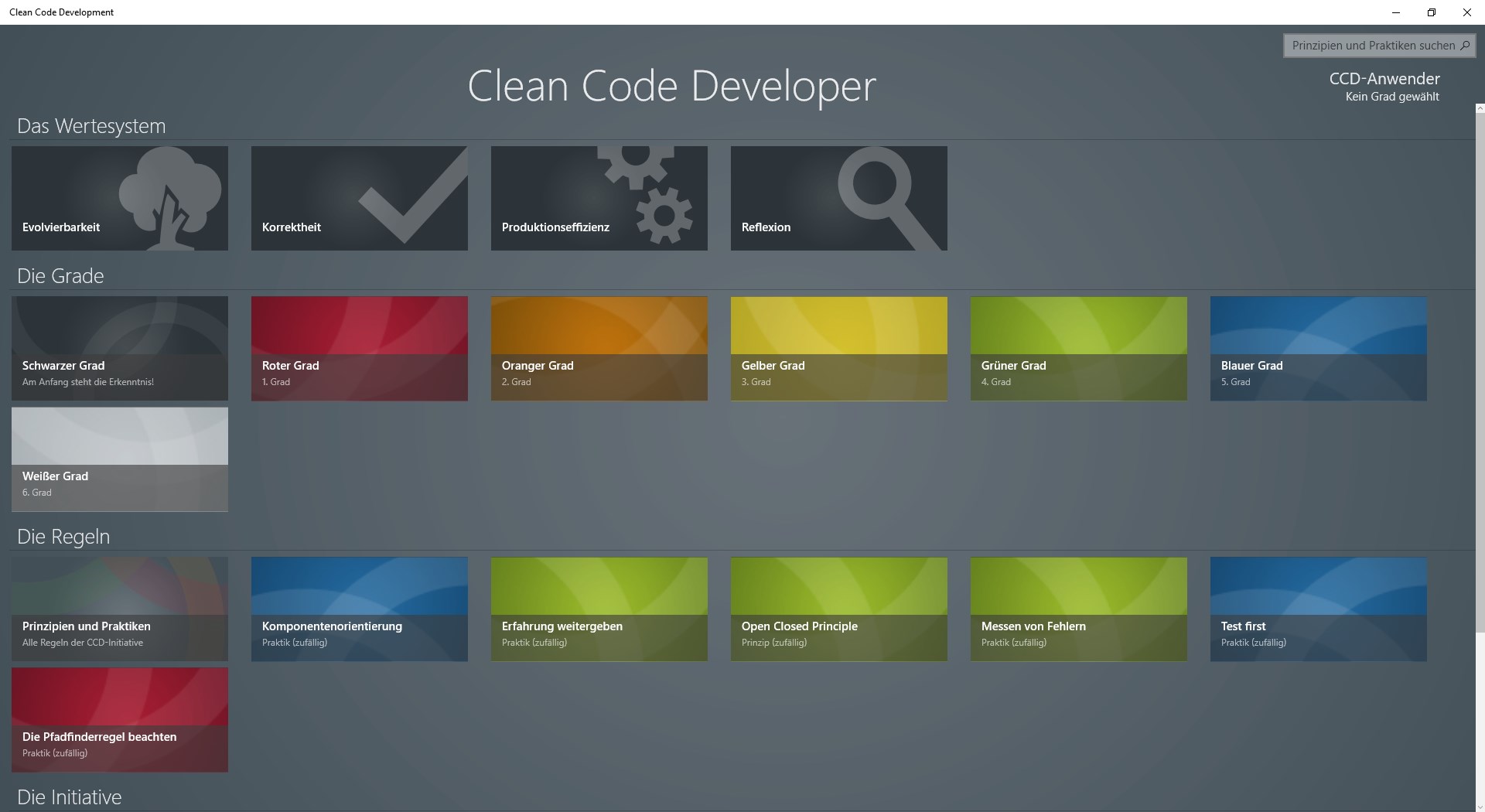 Die Clean-Code-Developer-App enthält eine Einführung in das Thema Clean Code Development (CCD), informiert über die CCD-Initiative und bietet eine Übersicht über die verschiedenfarbigen Grade und die dazugehörigen Prinzipien und Praktiken. Die App kann als mobiles Nachschlagewerk oder als Leitfaden von überall und auf jedem beliebigen Endgerät genutzt werden. Die verschiedenfarbigen Lernmodule unterstützen Softwareentwickler dabei, die Regeln und Werte zur Steigerung von Softwarequalität zu verinnerlichen und im Programmieralltag anzuwenden.