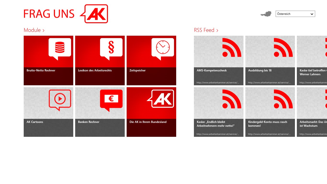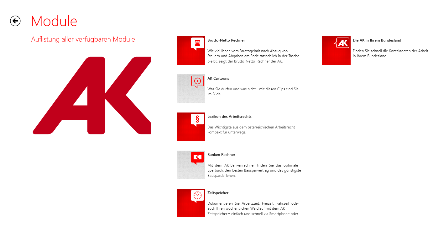 Services der Arbeiterkammer für unterwegs, z.B. Lexikon zu Arbeitsrecht und Konsumentenschutz, Brutto-Netto-Rechner, Bankenrechner, Zeitspeicher, AK-News-Feeds, AK Cartoons oder die AK-Kontaktliste.